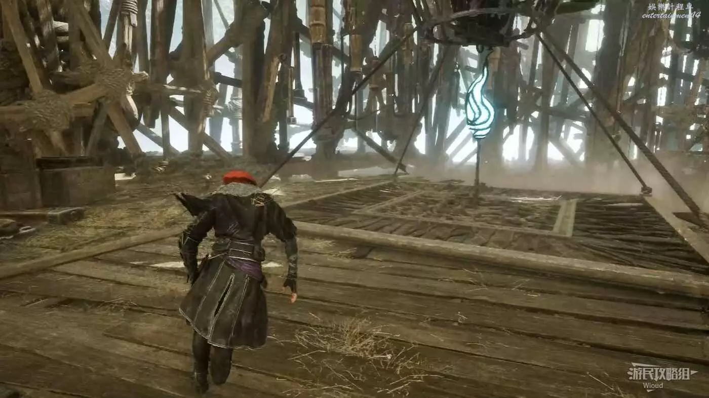 通過鉤爪移動到另一個地方,前方倆怪物右側平台有源色可撿,怪物左側懸崖處有個可對話的NPC。