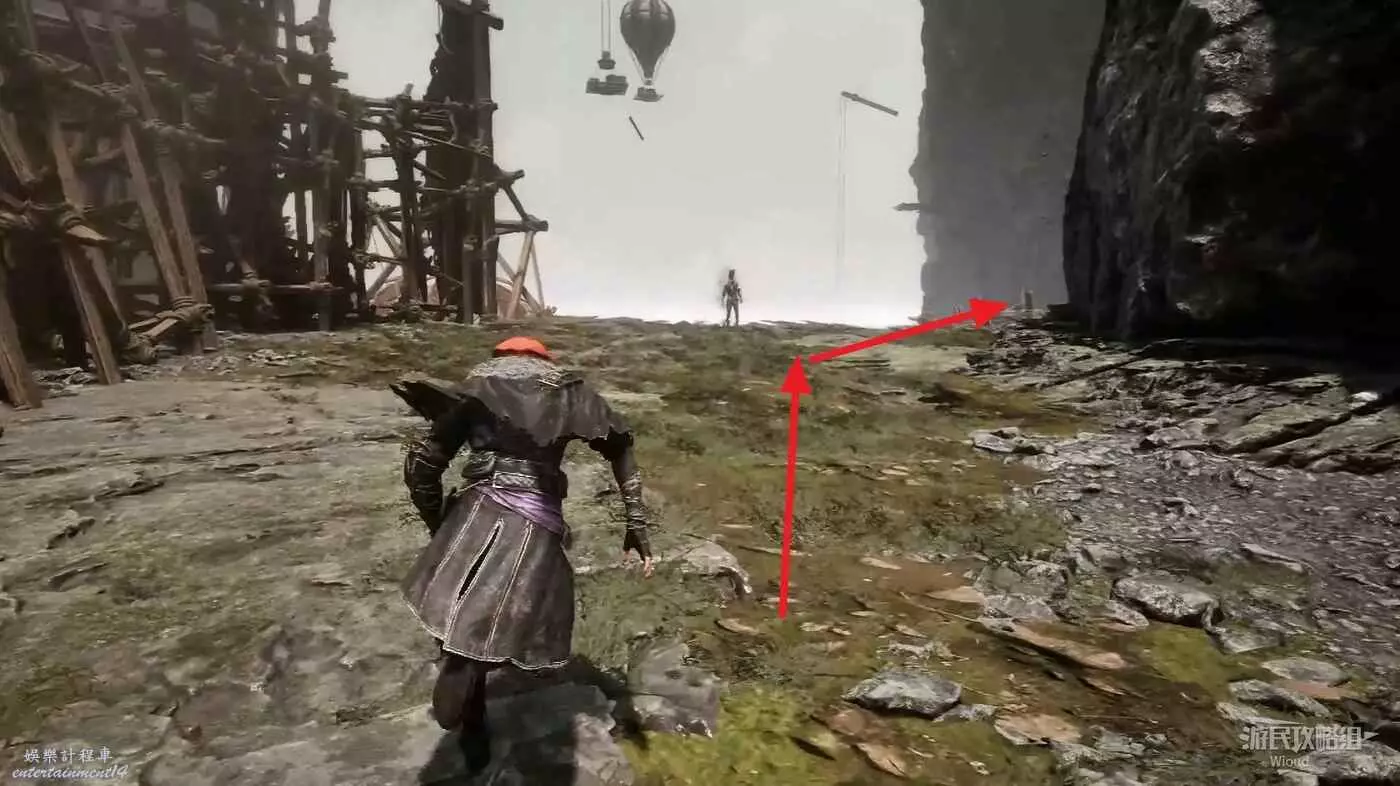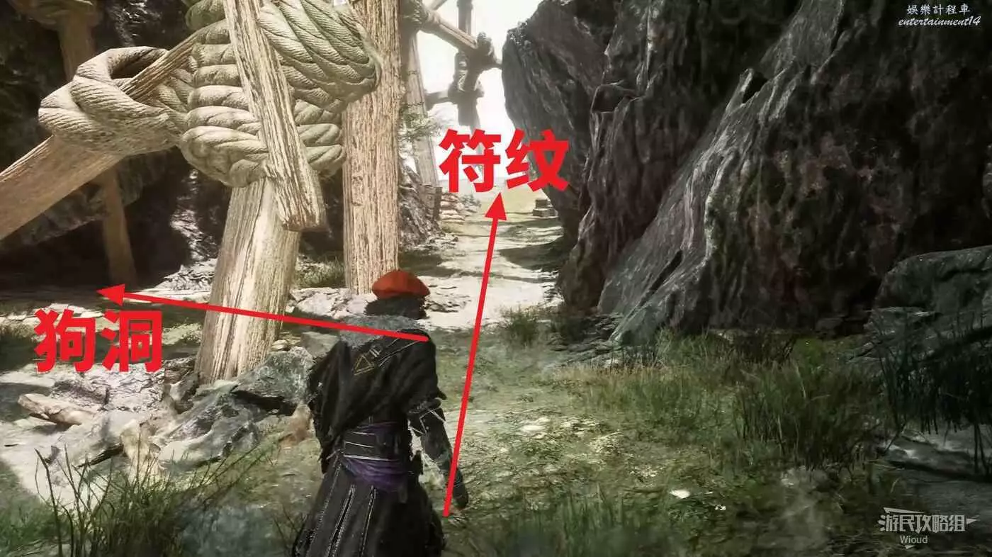 上坡走過去是一個岔路口,右側跳到盡頭平台可升級符紋,走主路到下一個熱氣球前,此處左側有個狗洞可以爬。