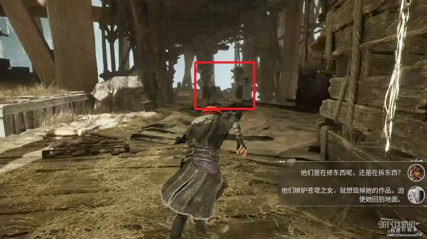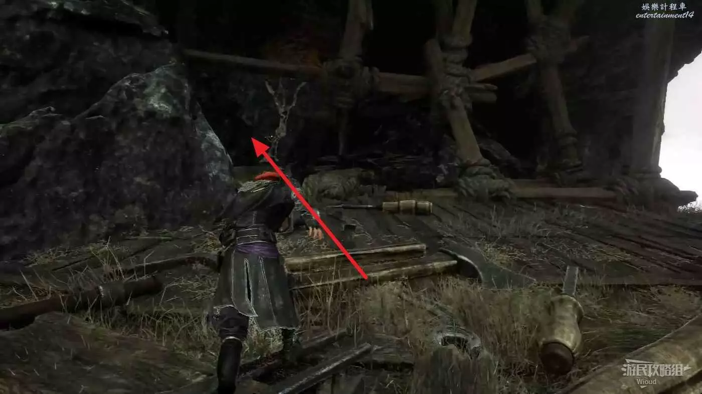 朝NPC右側的木橋走,直到通過一個長距離的鉤爪點,看到前方盡頭有倆怪物。