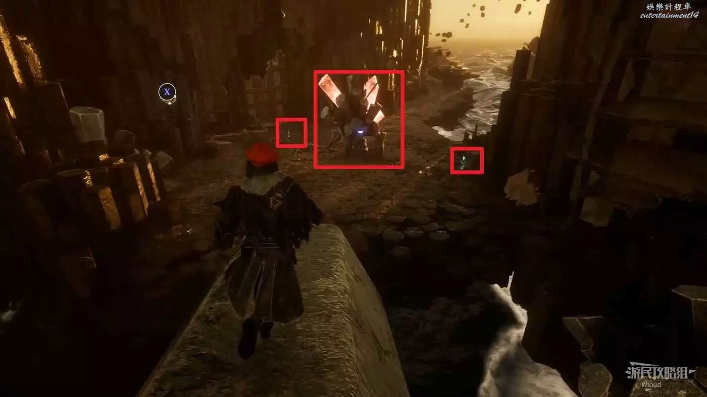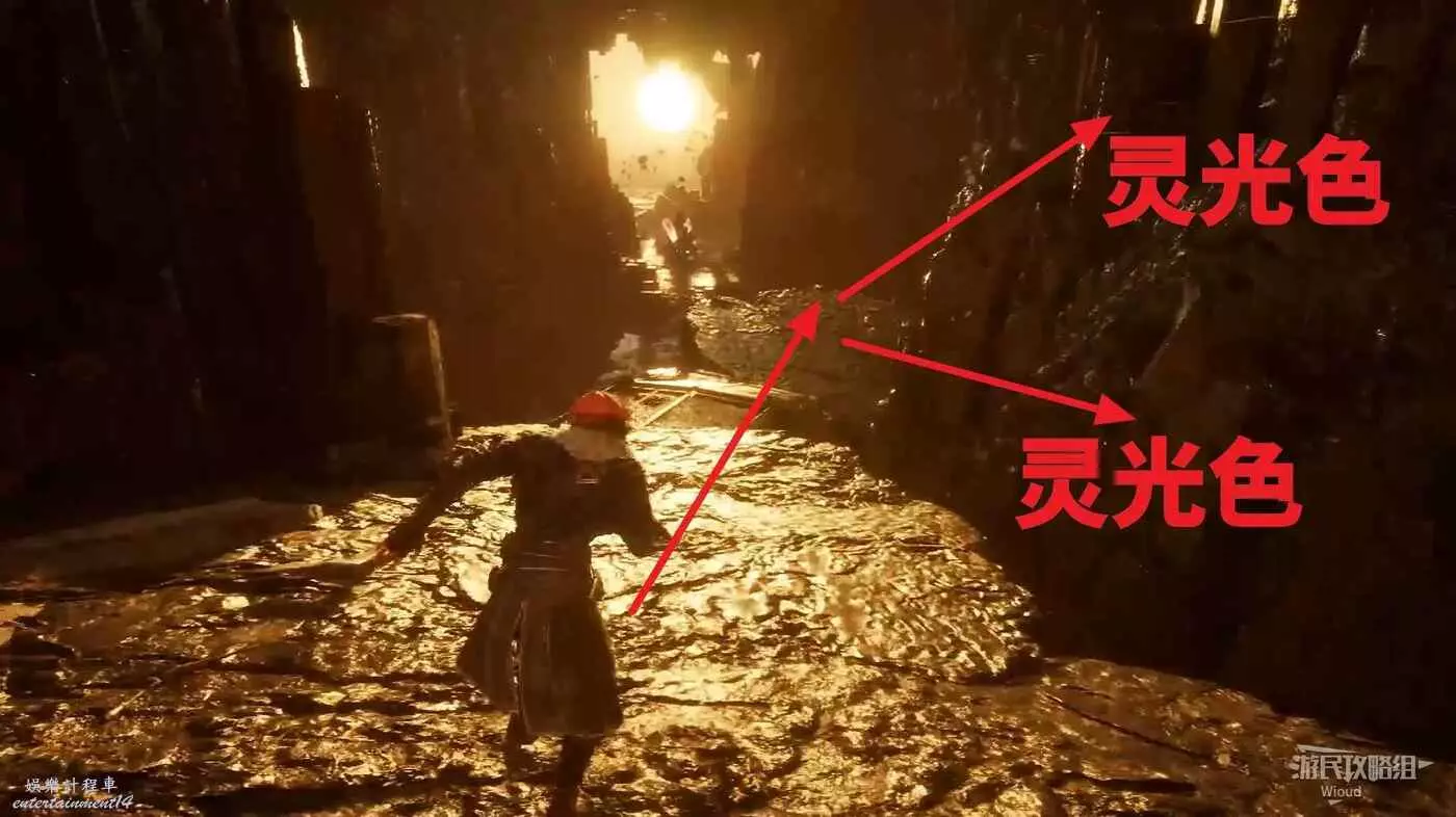 面對前方BOSS往右看,有個鉤爪點,跳過去走到頭也是【靈光色】,回到下圖位置往前走
