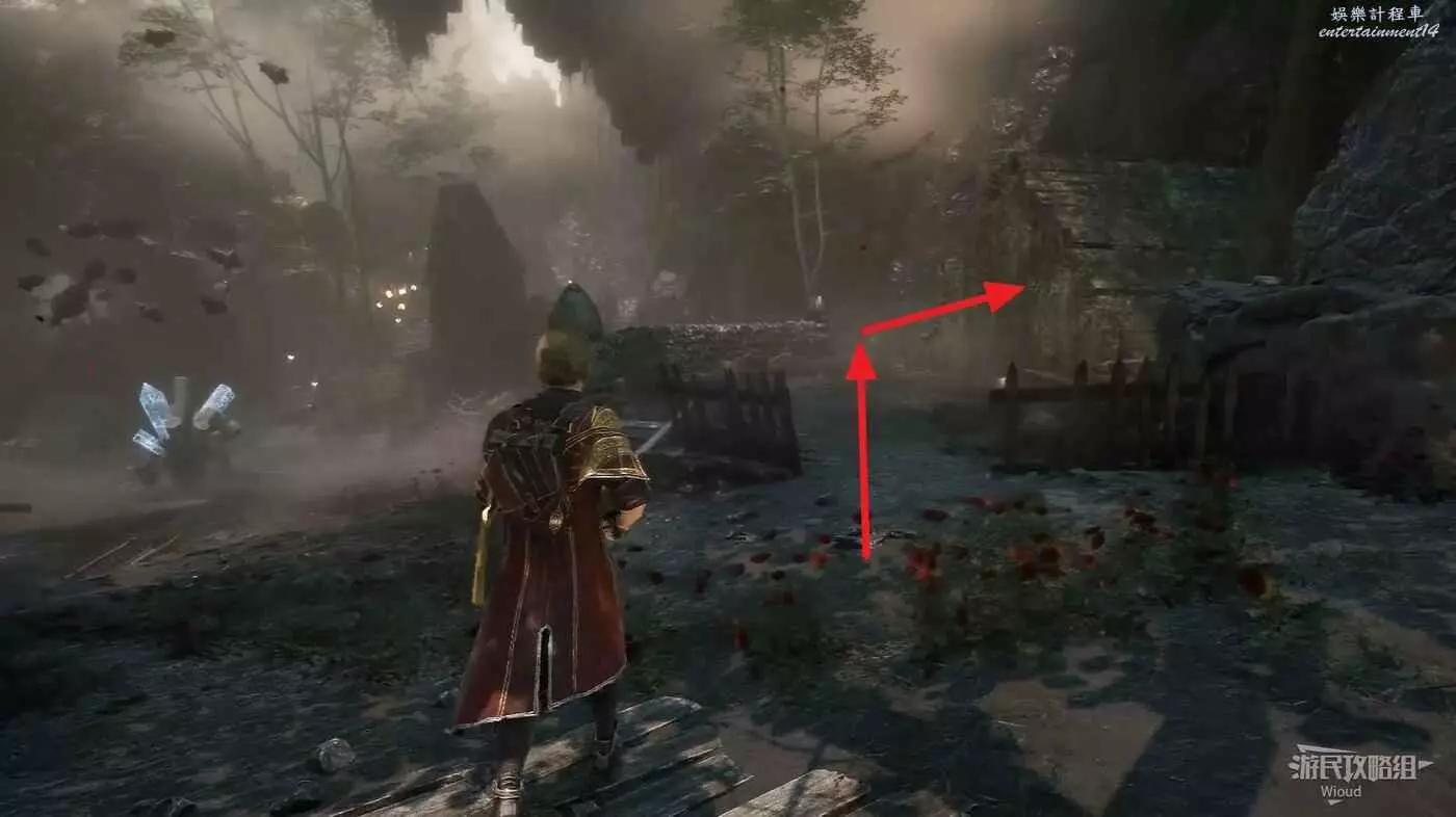 走到對面柵欄缺口但不要出去,院子裡往右繞進入穿過前方洞口。