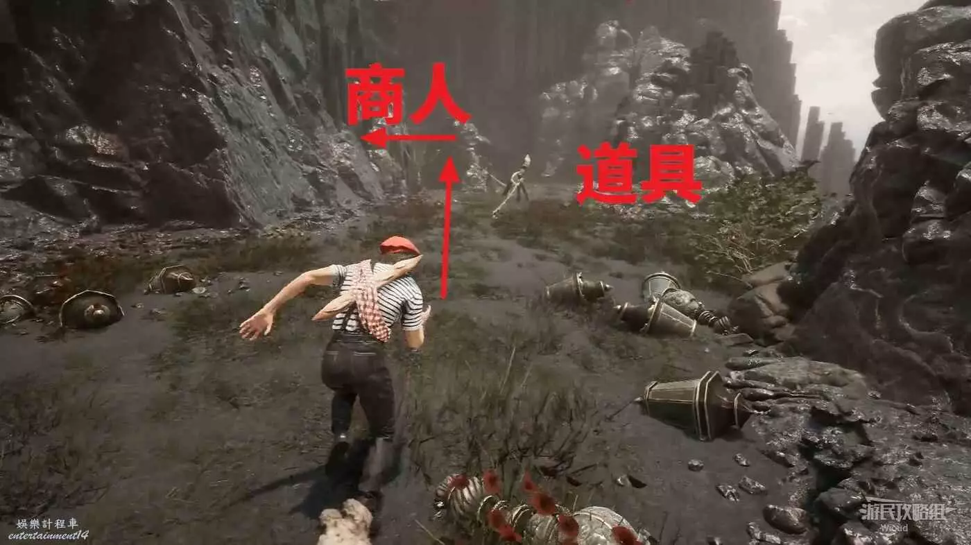 前方右側的石碓處有道具可撿,走到盡頭左拐有個狗洞,裡面可以找到個商人。
