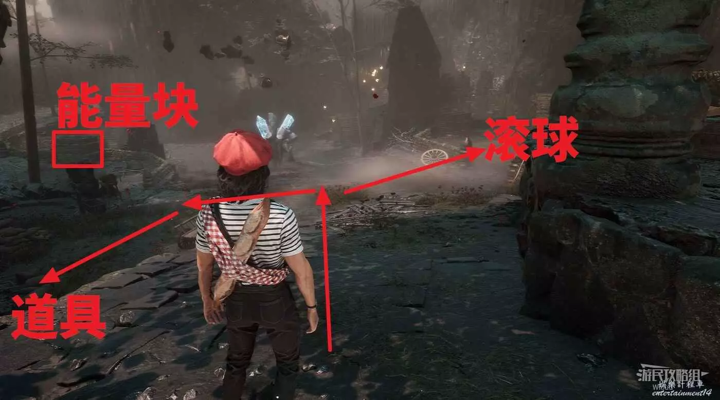 回到村莊入口,右側靠下的院子裡可以找到一個滾球,沿下坡下去往左後方繞可以找到一些道具。