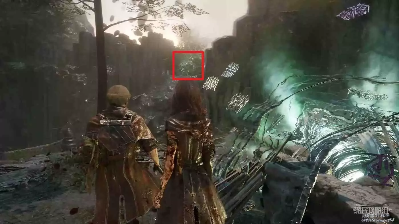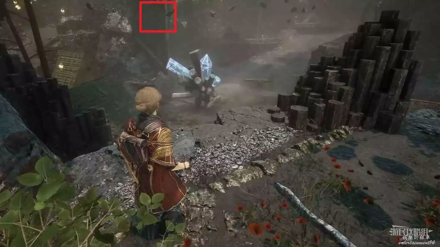 此時視角往左移,左側遠處有棵樹,最後一個能量塊就在樹的位置,然後拾取道具點獲得武器【逆刃刺】。