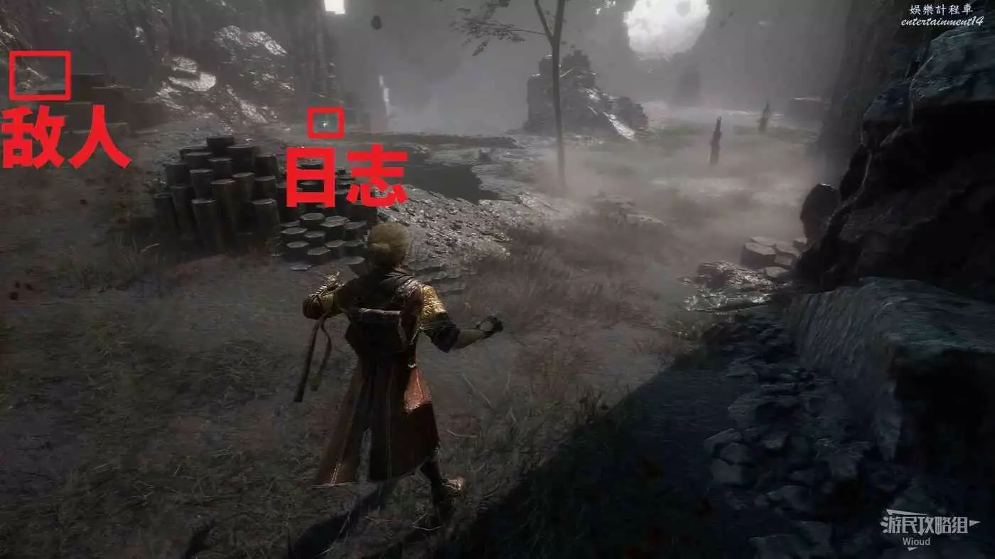 走不遠就能看到三個敵人,我們往左走,擊敗左側黃色的敵人可獲得武器【黯爪鐮】與符紋【振奮傷痛】,移動到左前方可撿到【56號遠征隊日誌】。