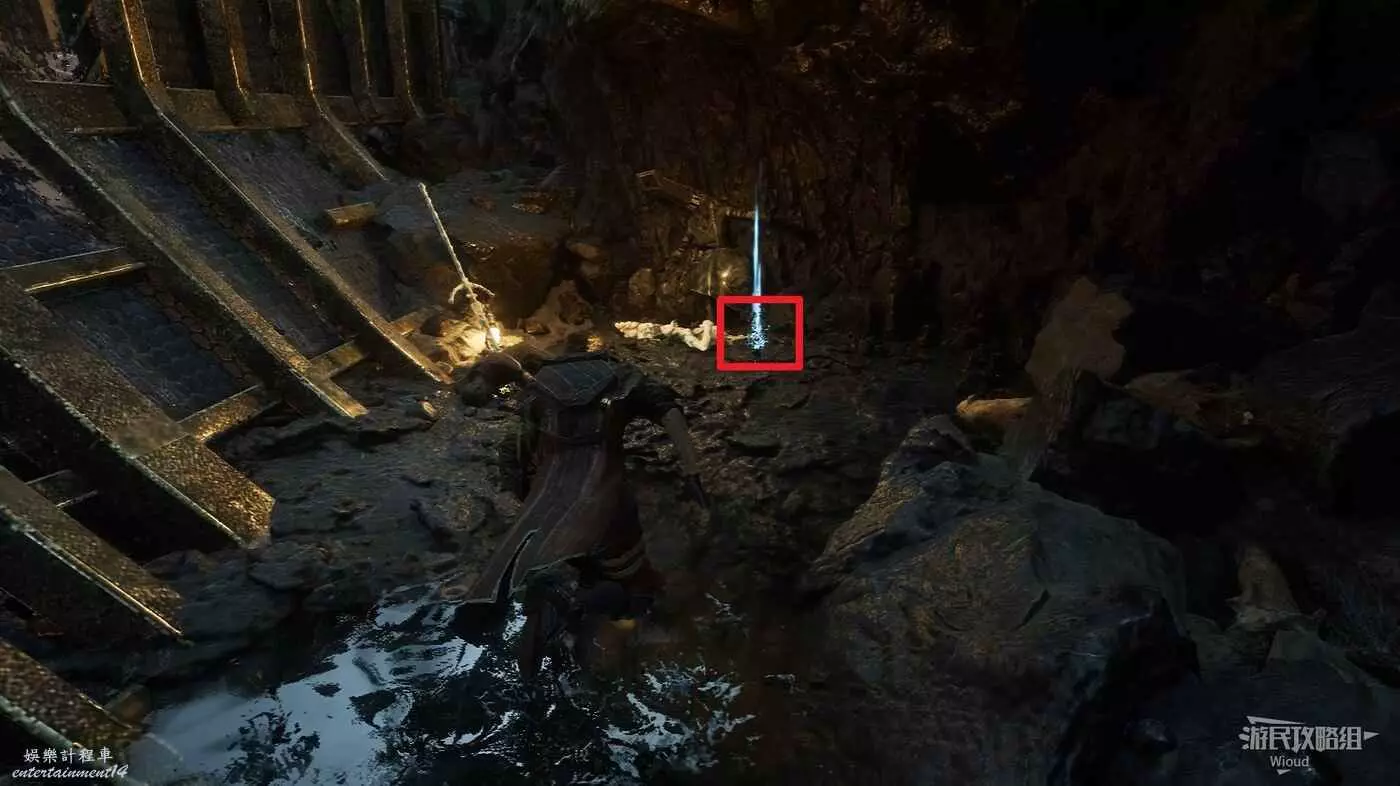 繼續往後走,不一會來到一個開闊區域,先不管中間的敵人,貼著右牆走到盡頭,可撿到一個【靈光色】。