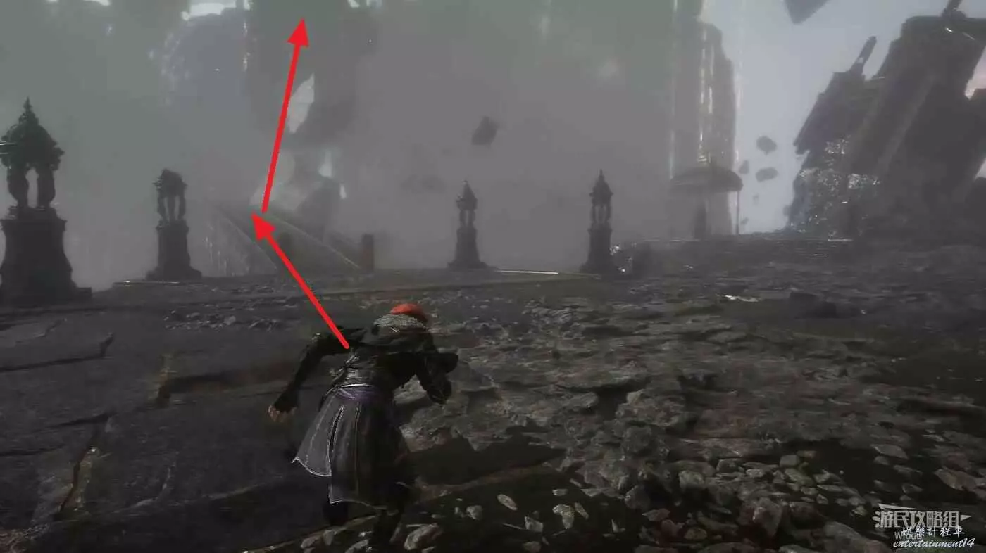 爬完一段向上的樓梯立刻往右後方繞,可以撿個強化道具。