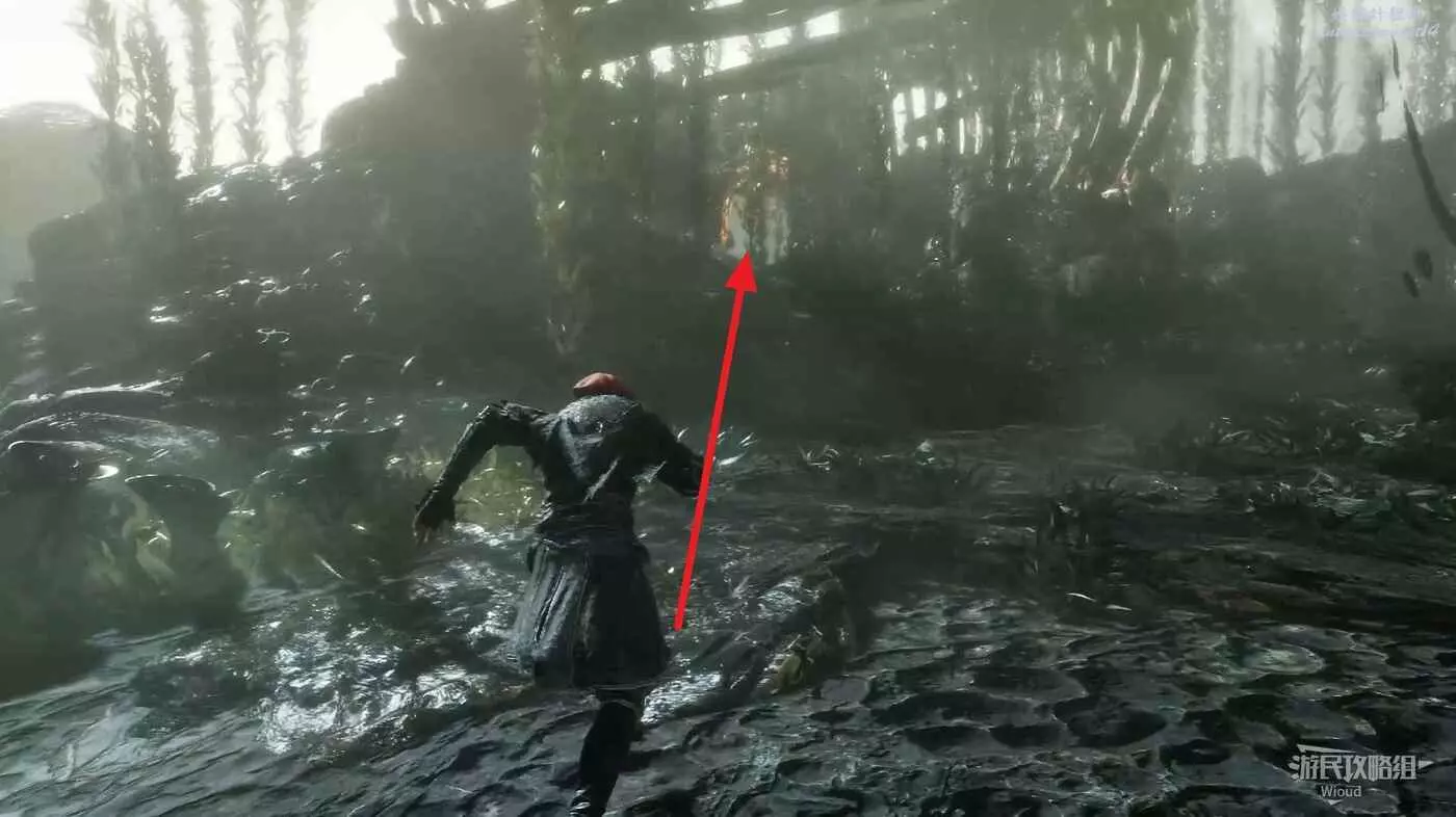 旗幟位置往左走,盡頭處可以看到一個魚骨殘骸入口,往裡走穿過幾個鉤爪點。