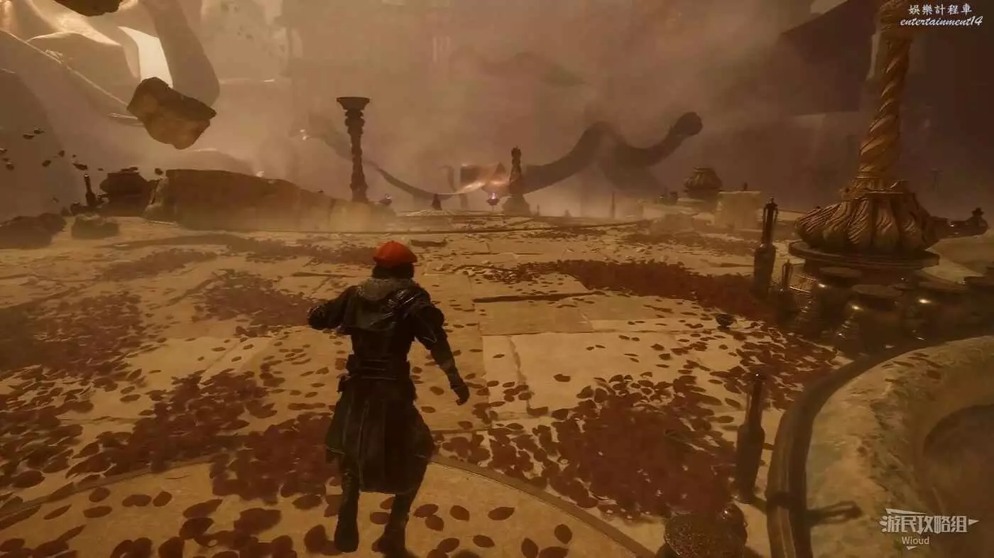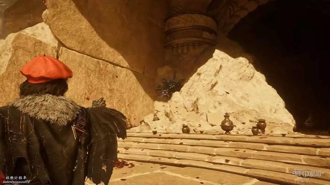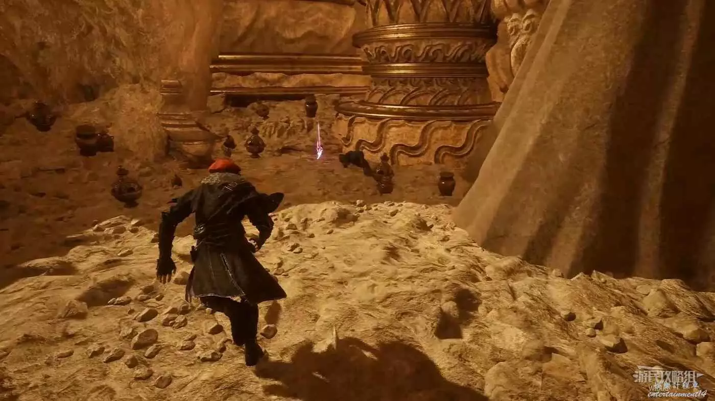 繼續往前走,穿過一小段向下的樓梯來到一個全是怪物的方形區域,此處右側可拿到【55號遠征隊日誌】,然後走左側到達一個岔路口,用破障破壞岔路右側的繪柱可拿到一些強化道具,最後通過岔路左側繩索往下走。