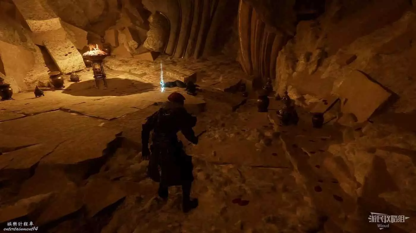 沿著梯子往下爬,通過繩索點下到底部找到第二個滾球,繼續沿路走,穿過兩個方形建築前,左側可以撿到一個【靈光色】。