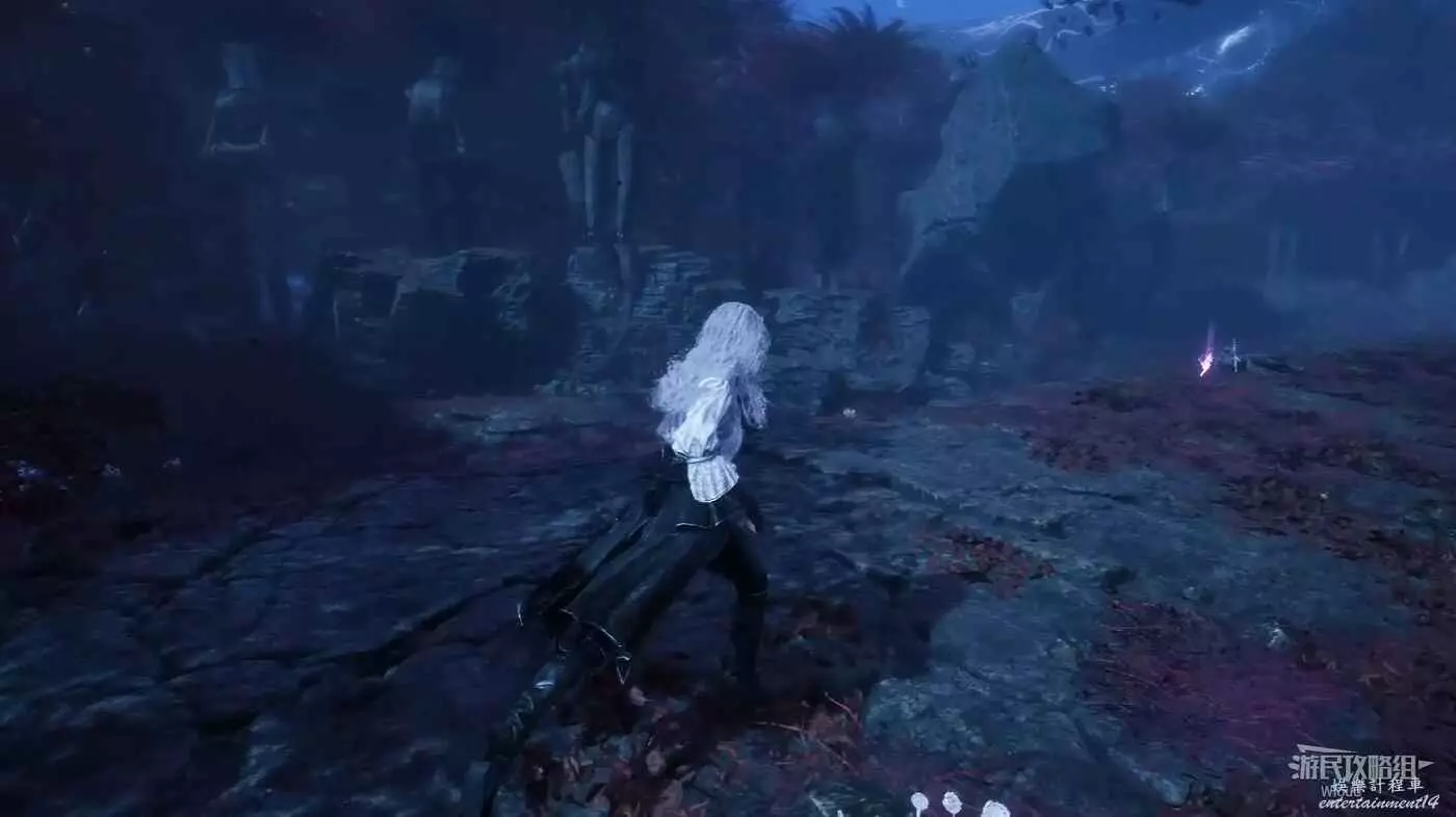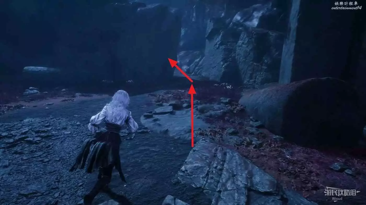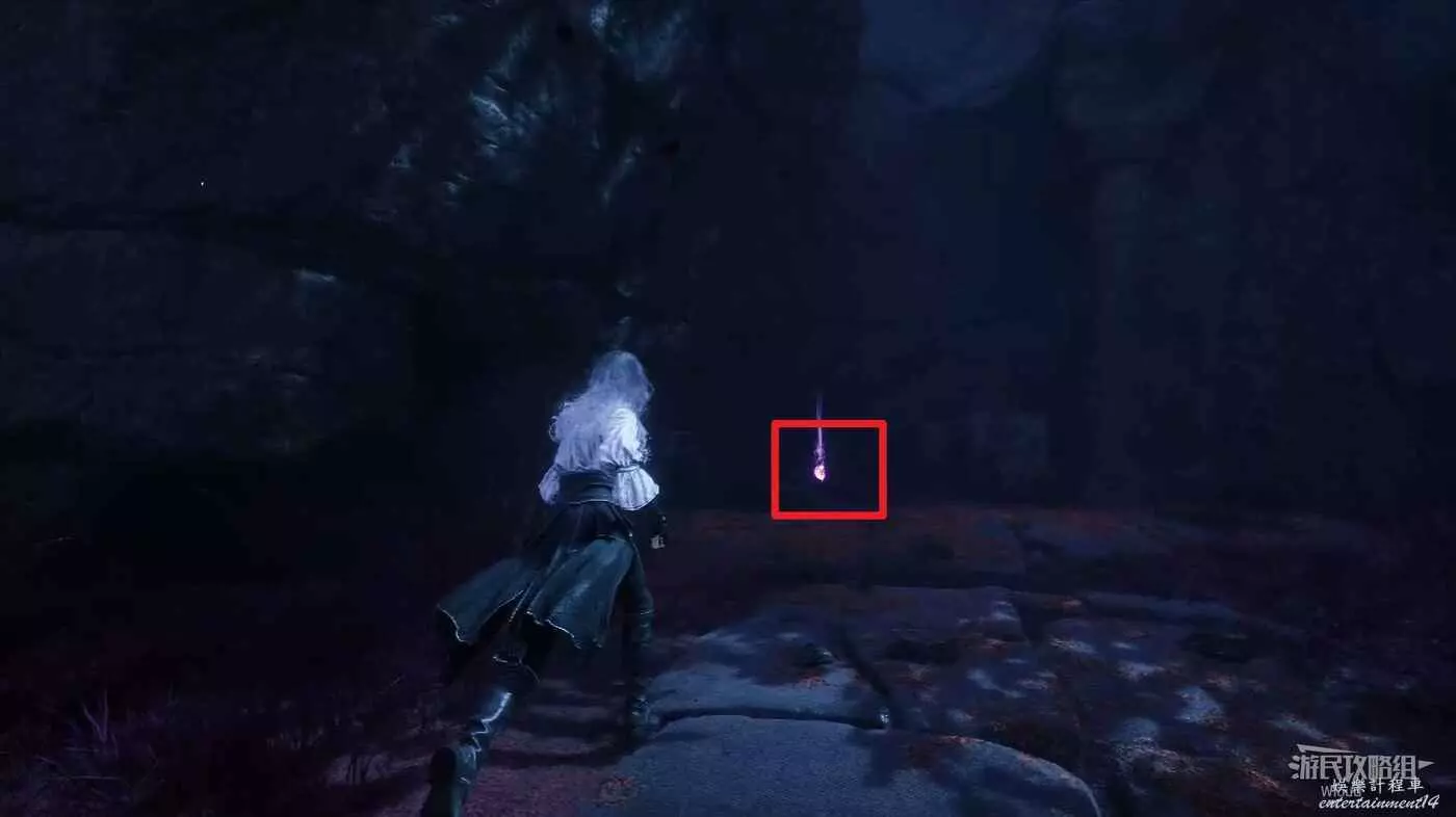 然後走巍民經怪左側岔路的最左邊道路走到一個開闊區域,這裡貼著左牆找到第一個凹口,裡面有【靈光色】可拿。