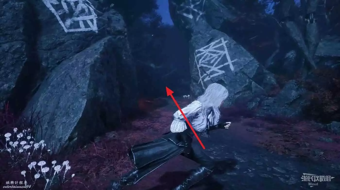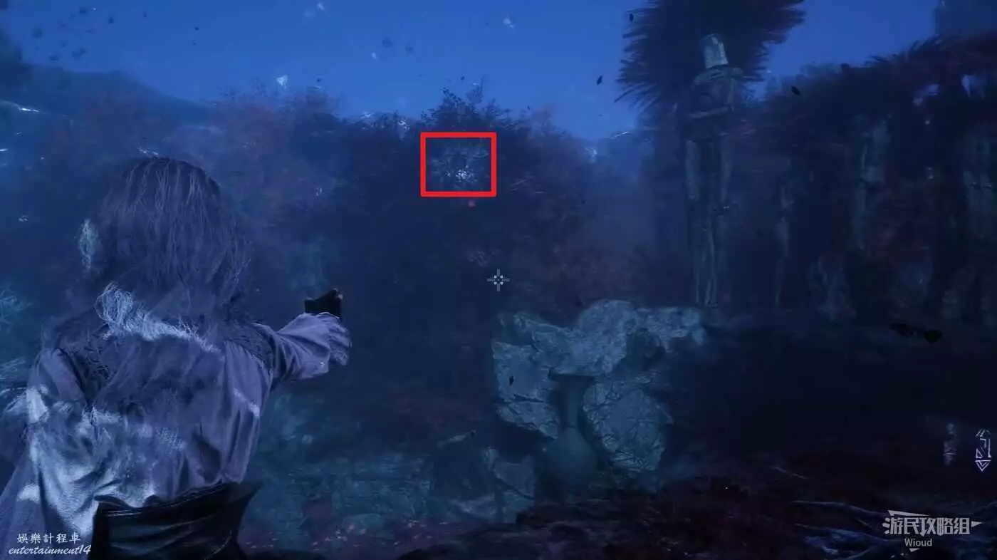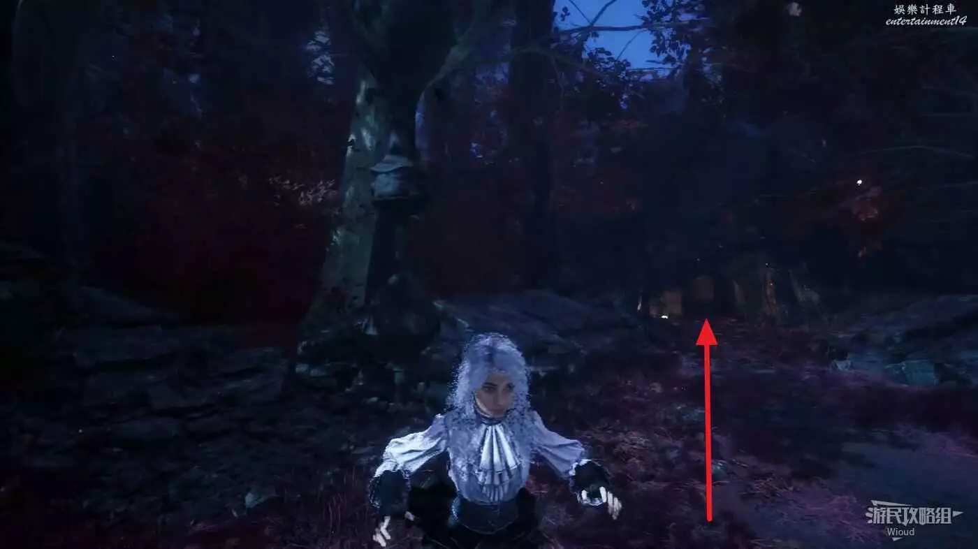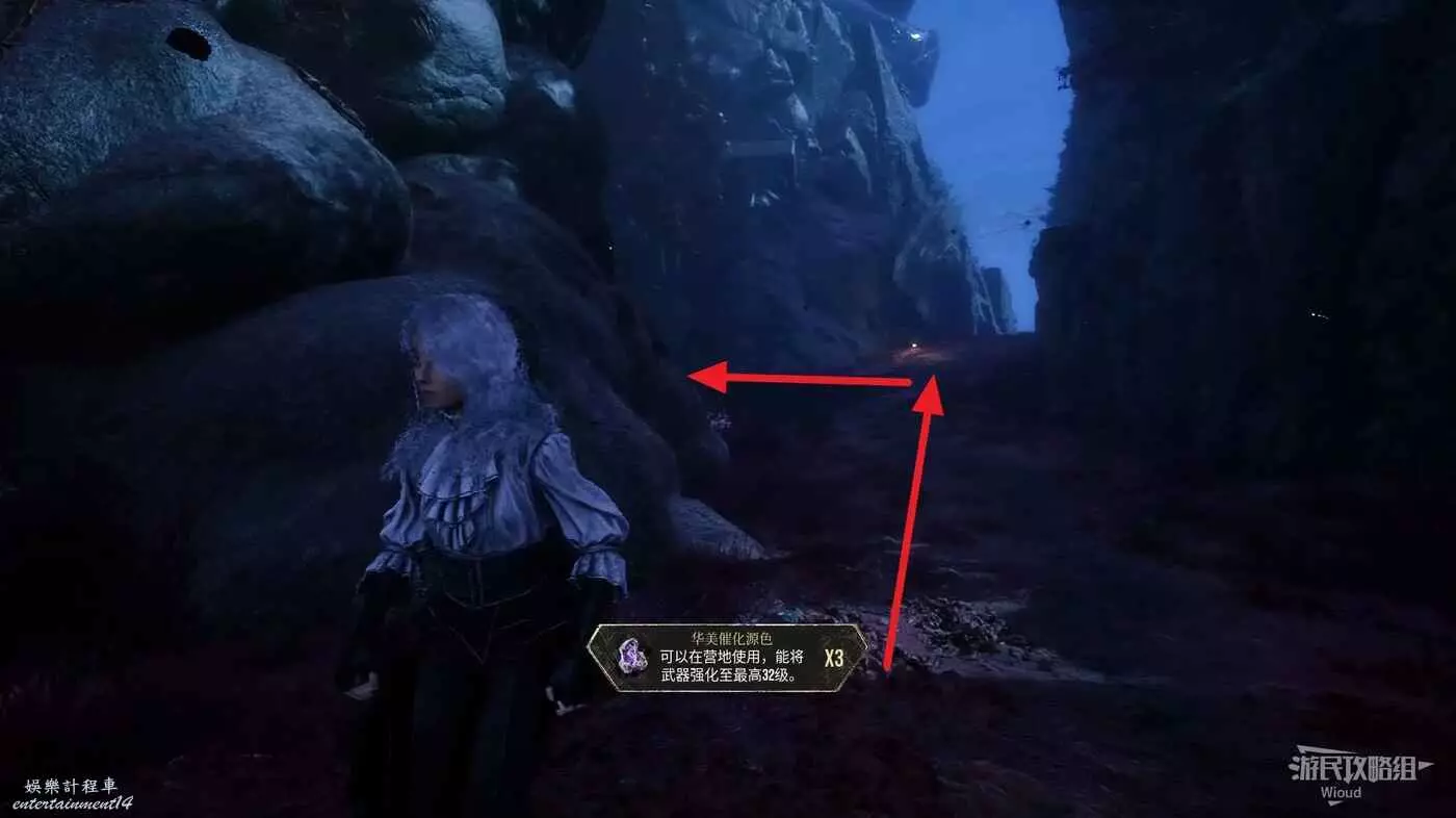 然後走巍民經怪左側岔路的最左邊道路走到一個開闊區域,這裡貼著左牆找到第一個凹口,裡面有【靈光色】可拿。