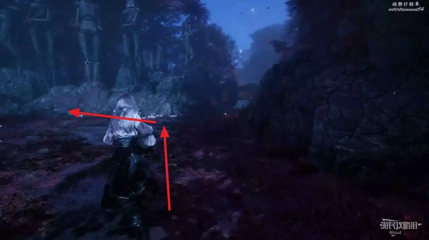右轉擊敗一個持盾敵人,沿路走到一個Y字路口,右側是一個小洞,我們先沿著左邊道路繼續走。