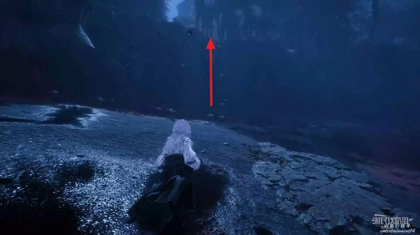 擊敗一個巨大敵人跟隨下圖箭頭所示位置走到頭,跳到底部有【靈光色】可拿。