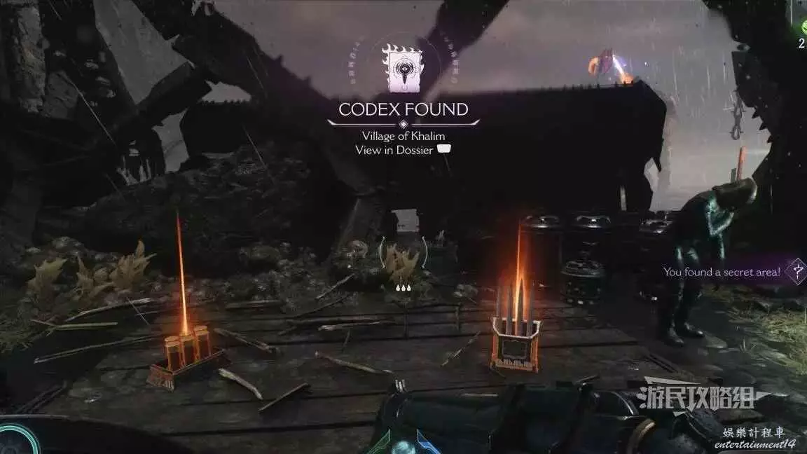 在第22章開頭用盾牌沖過綠色大門後,先不要跳到下層戰場,沿著右側道路前進就能看到這個百科。