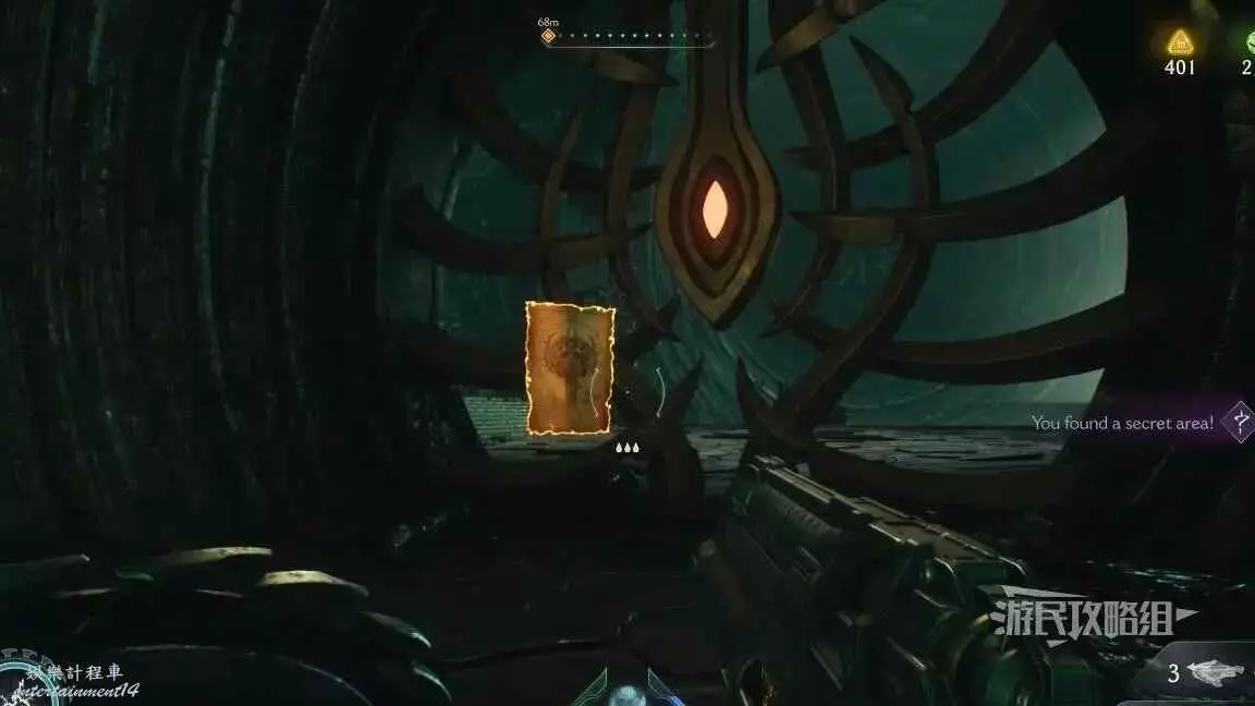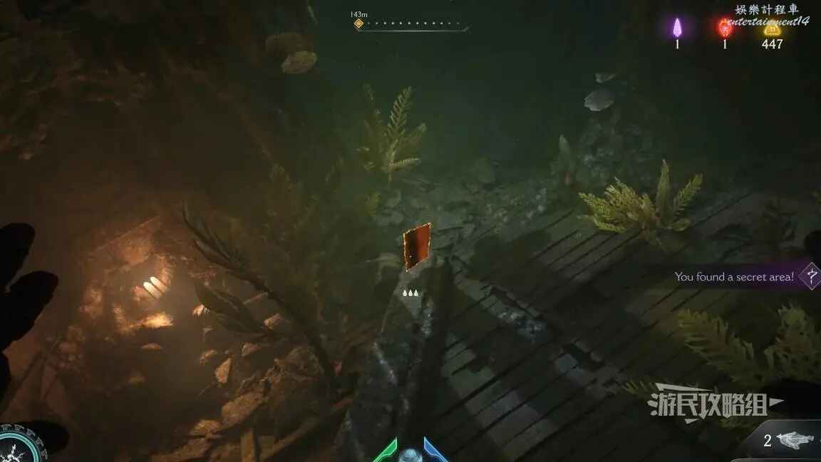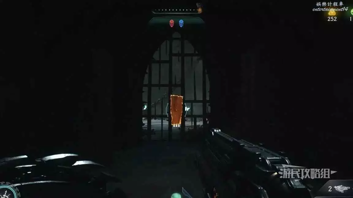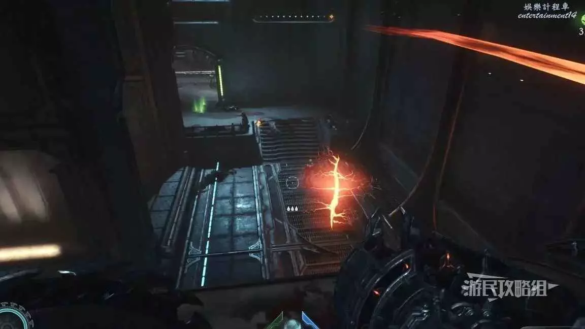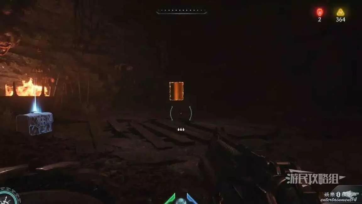 在第二章開頭需要拉動一個拉杆開啟一扇門,進門後直走就能到達下一個區域,經過兩側有綠色光條的門時,左轉跳過箱子就能進入秘密區域,百科條目就在這個秘密區域裡。