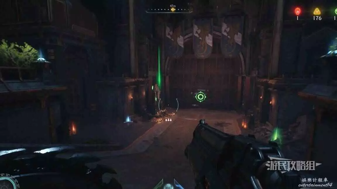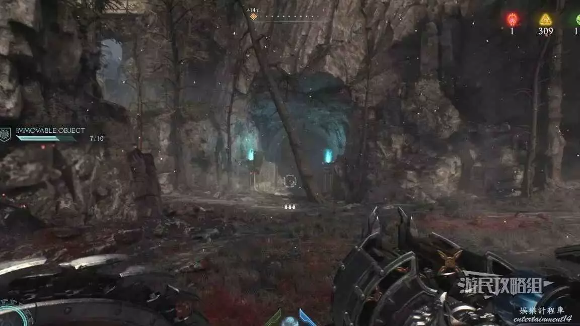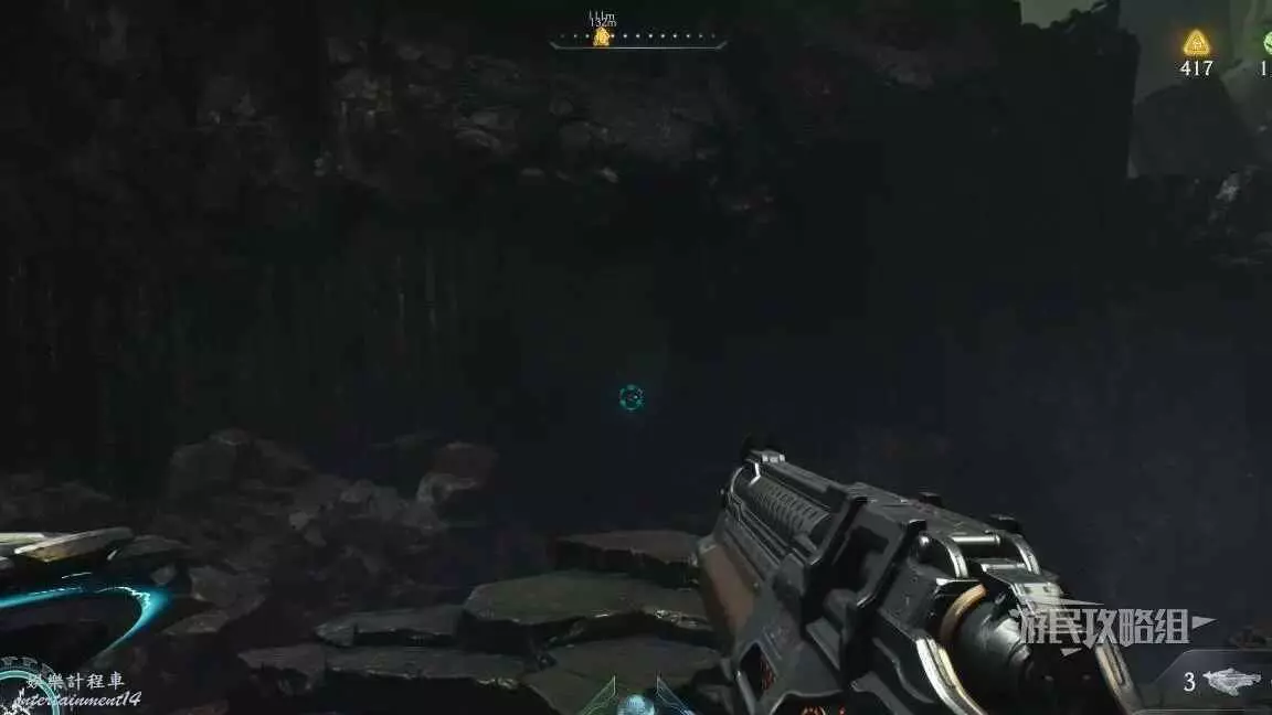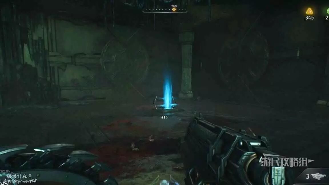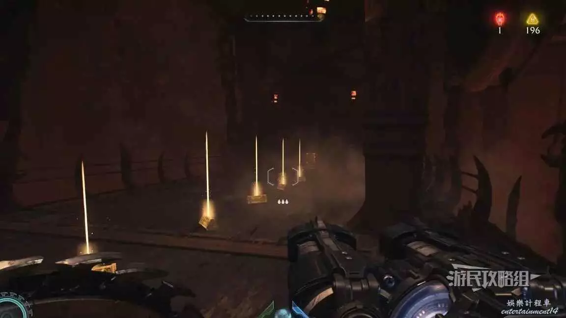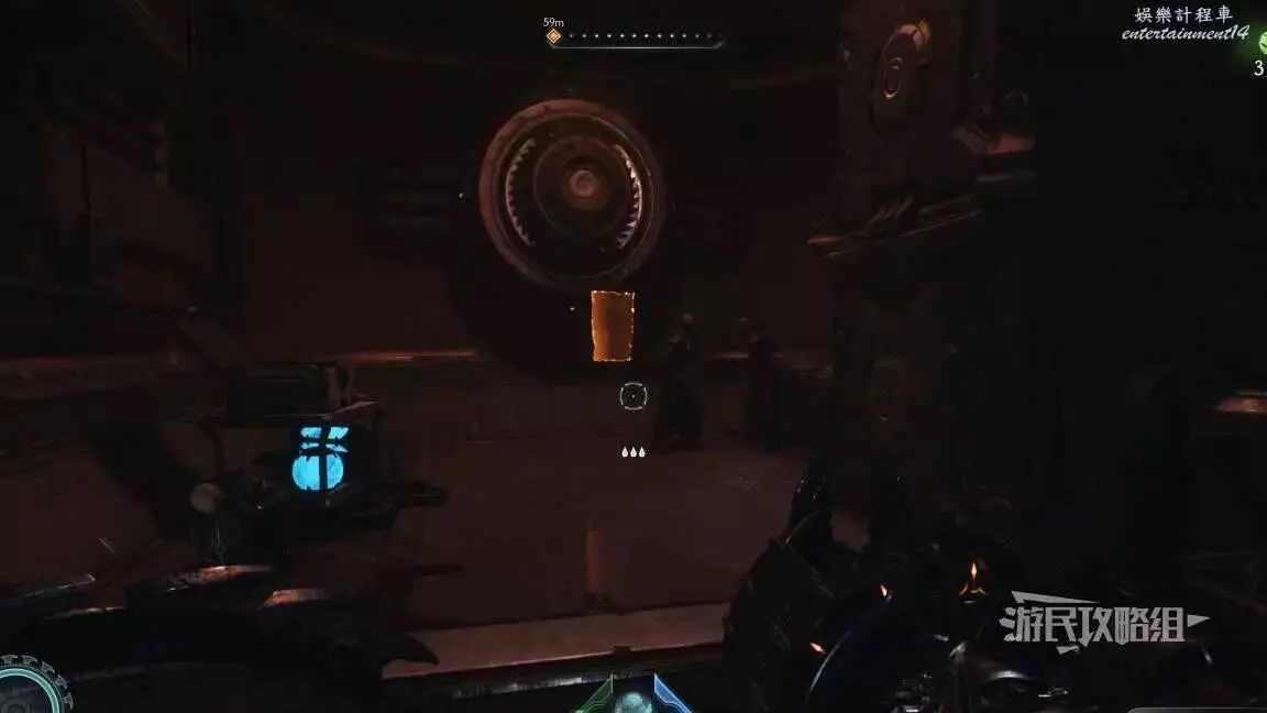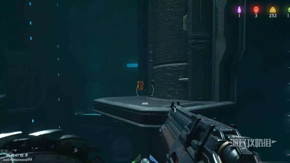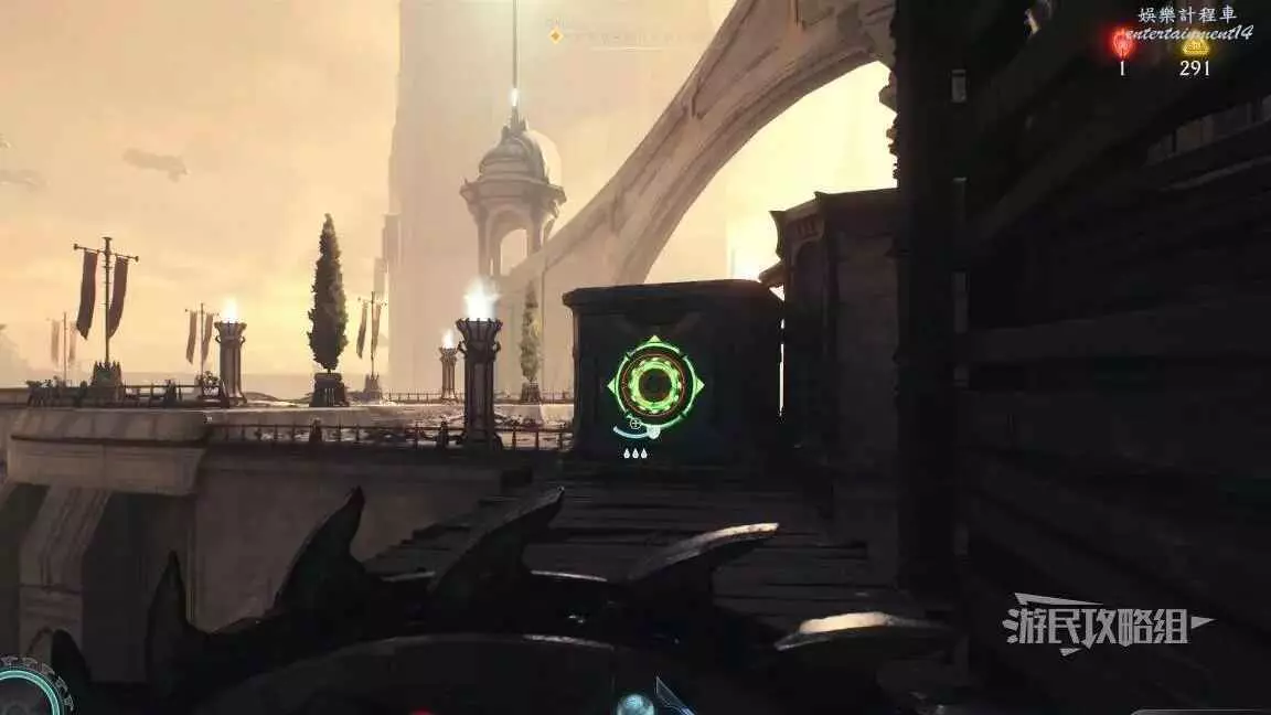 在前往移動平台的地下部分期間,把盾丟向藍色齒輪,然後面向藍色齒輪可以看到一個紅色十字,用盾牌打碎紅色十字,再次用盾擊中藍色齒輪啟動升降梯,但不要繼續往前走,跳回剛才降下來的平台,然後使用綠色盾牌雕像跳到新的平台上,往旁邊平台上看就能看到這個百科,還能拾取到武器皮膚。