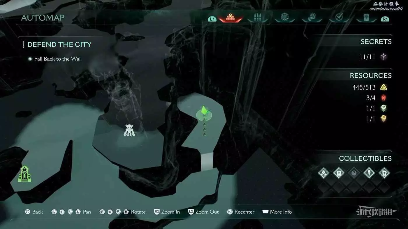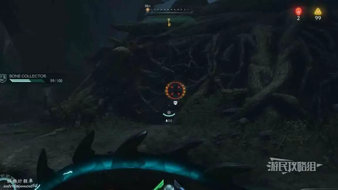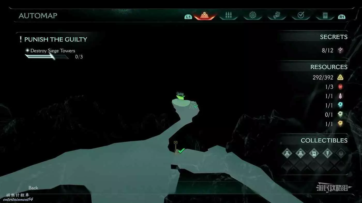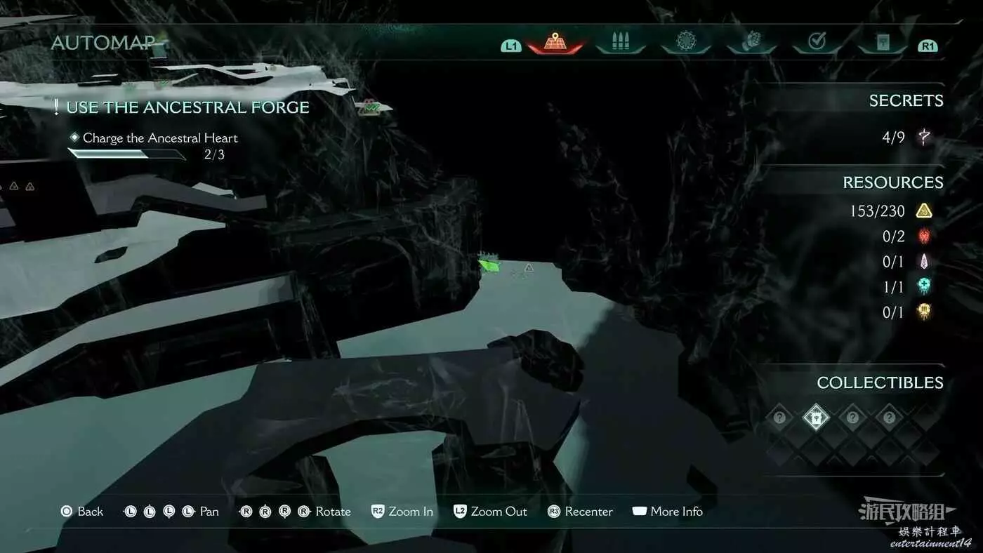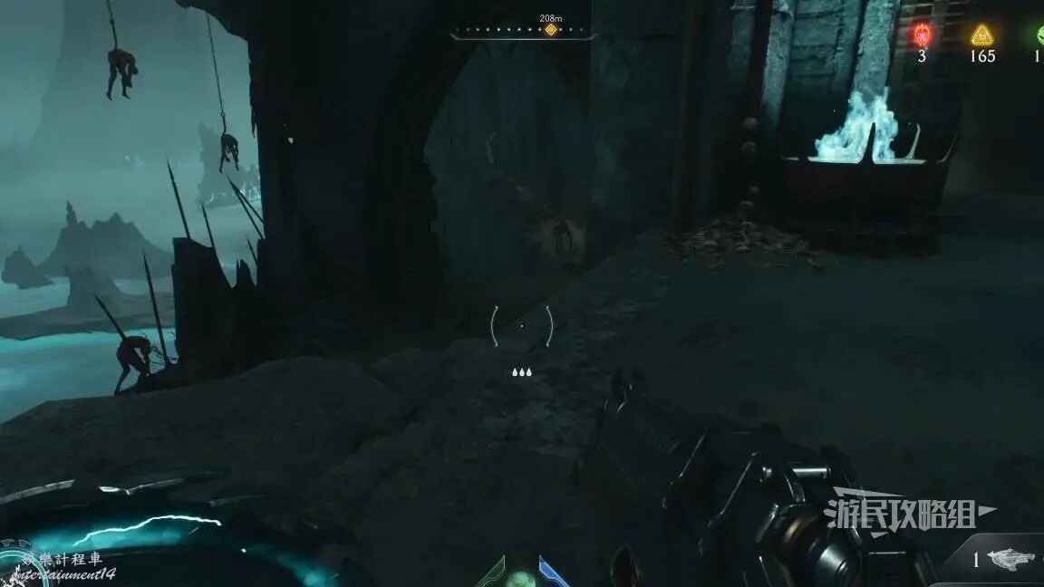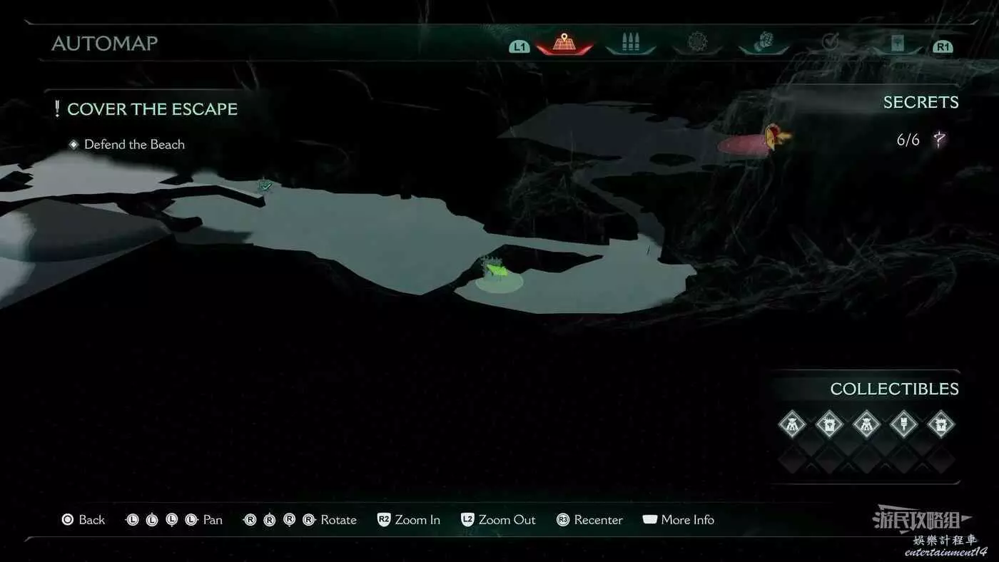在第14章前期需要降低水位線才能與靜態發射器互動的區域,完成進入巢穴觸發的戰鬥後,沿著與標記相反的方嚮往下走一個斜坡,右側柱子上有個綠色盾牌雕像,從這裡往下跳就能看到這個百科。