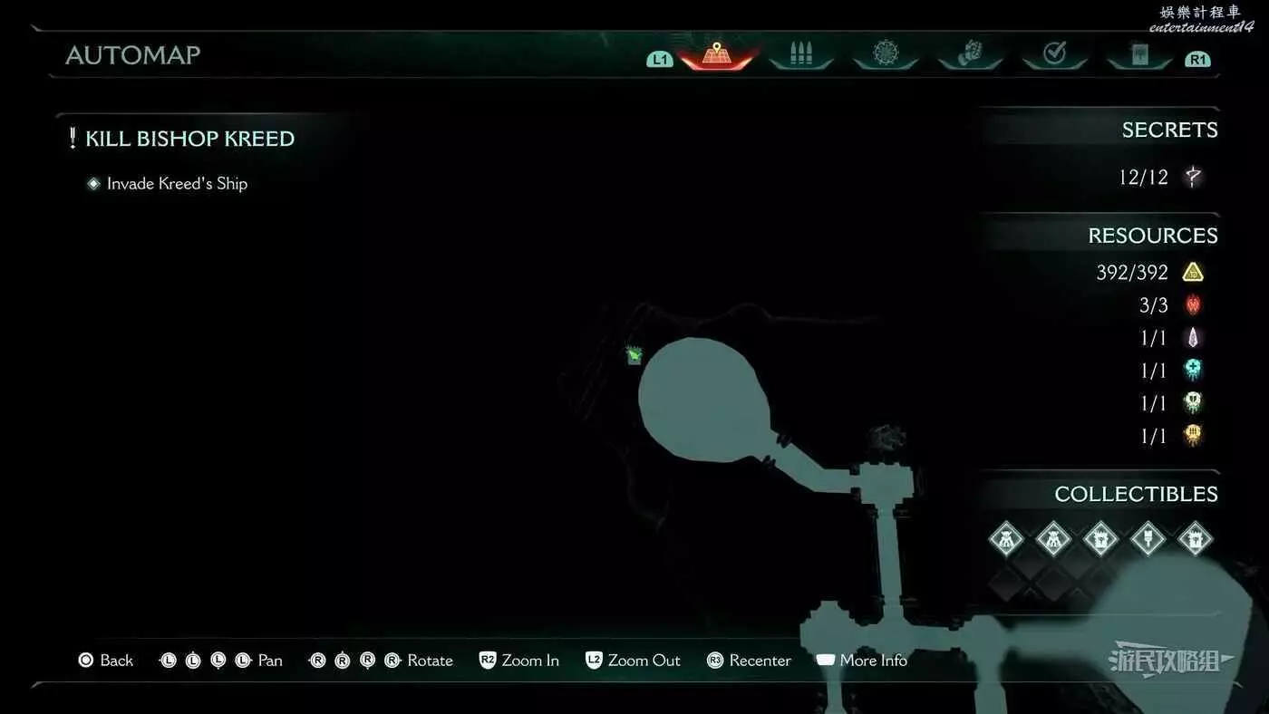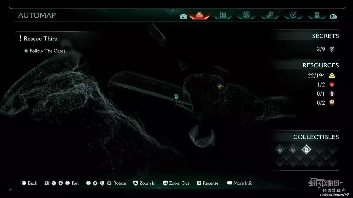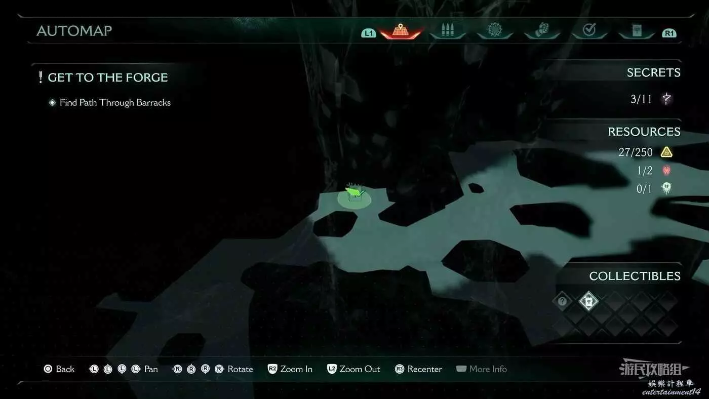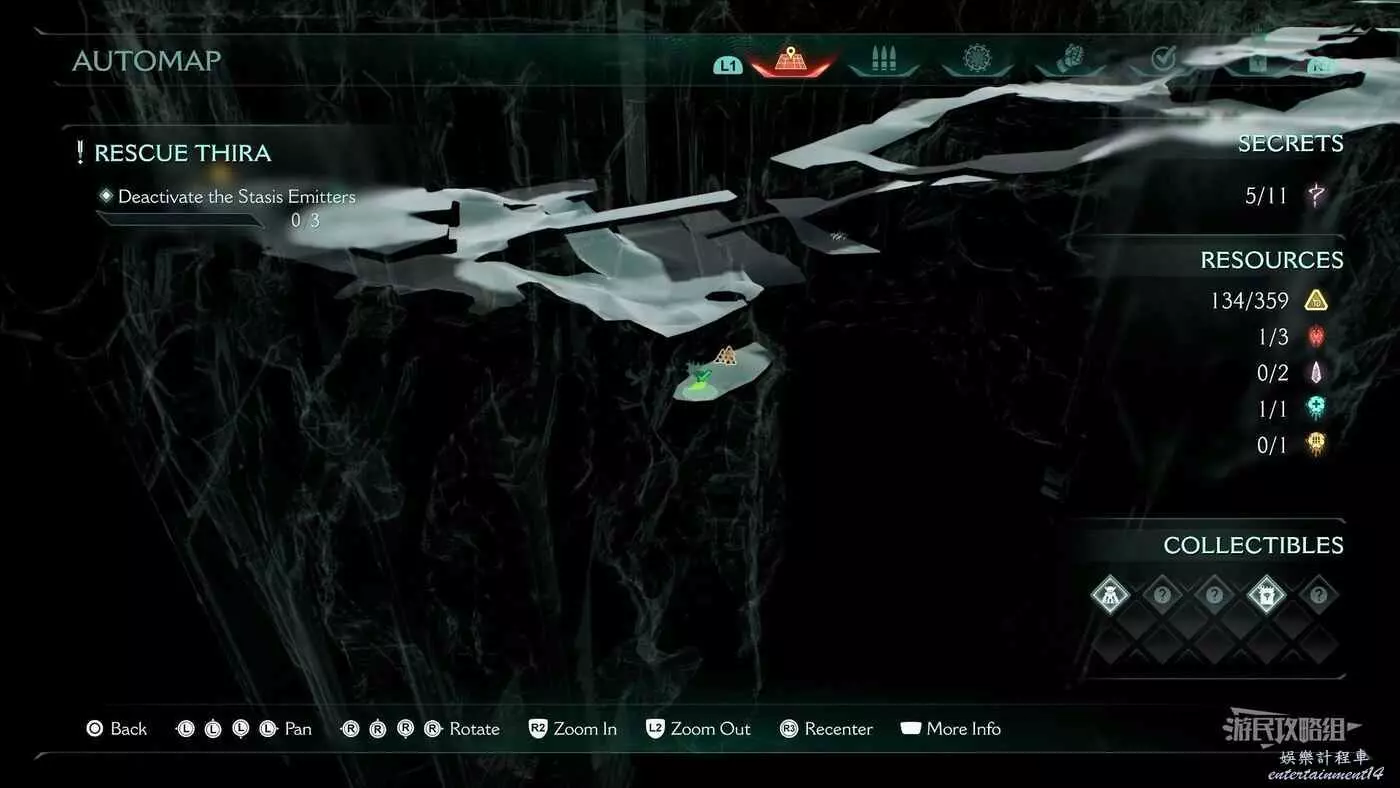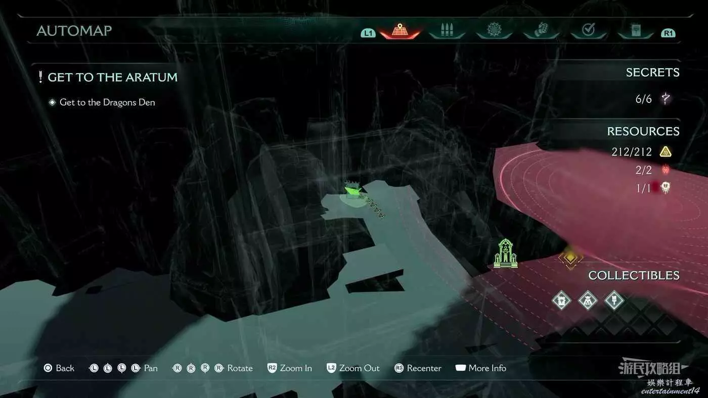 在第14章前期需要降低水位線才能與靜態發射器互動的區域,完成進入巢穴觸發的戰鬥後,沿著與標記相反的方嚮往下走一個斜坡,右側柱子上有個綠色盾牌雕像,從這裡往下跳就能看到這個百科。