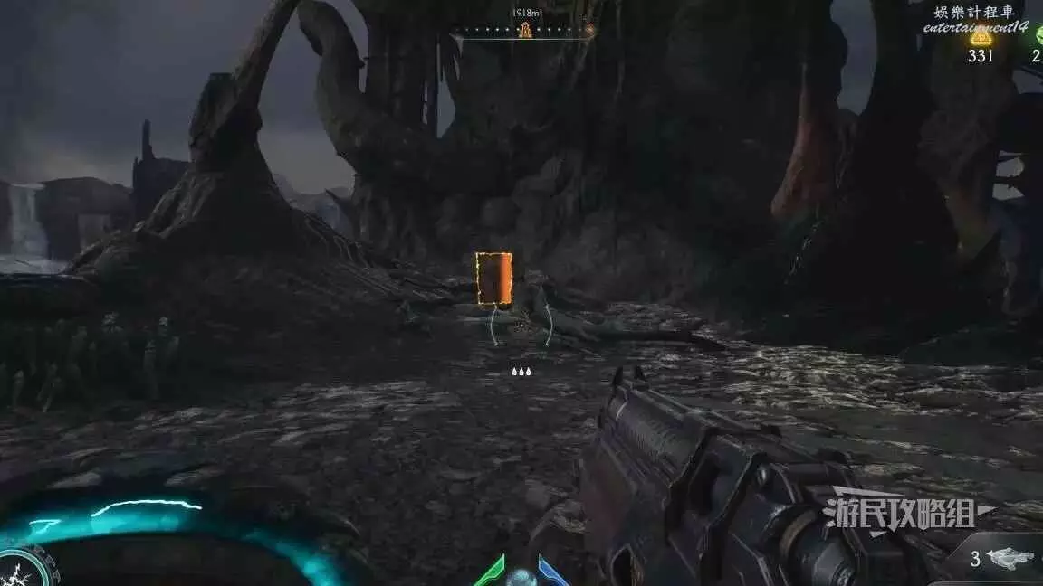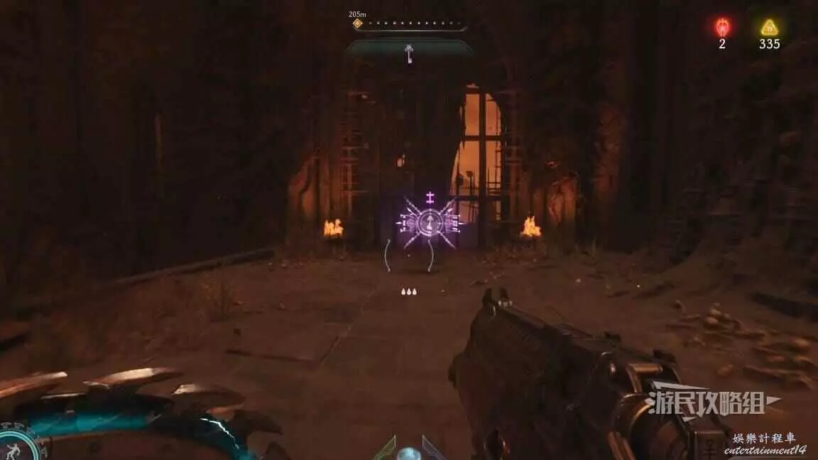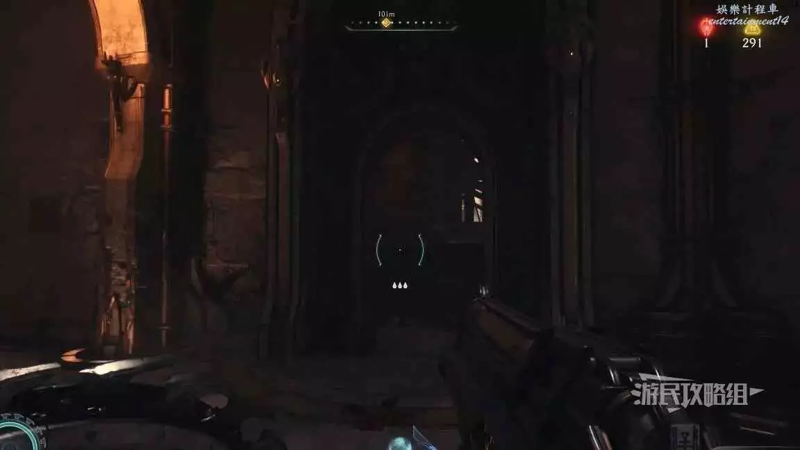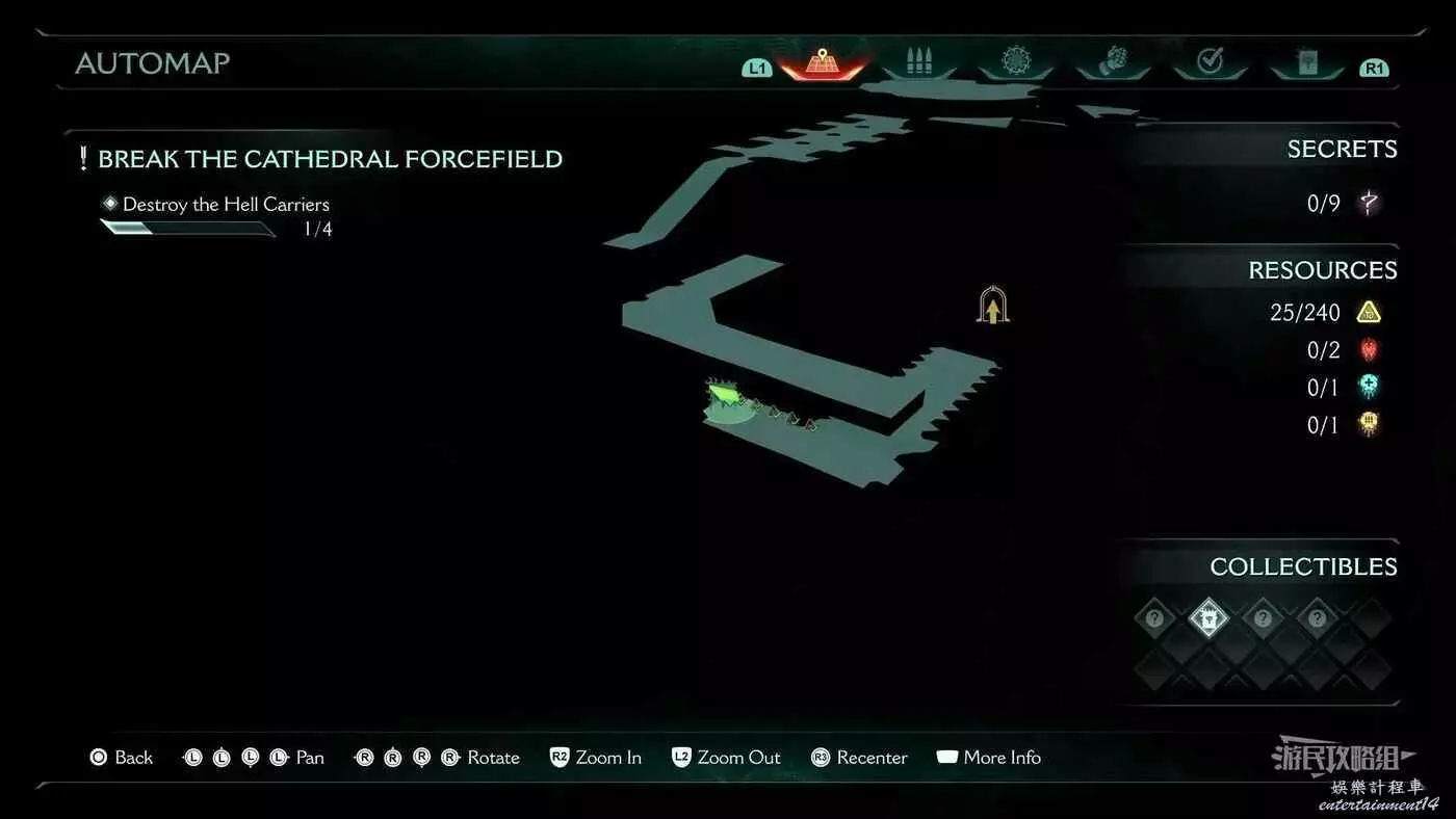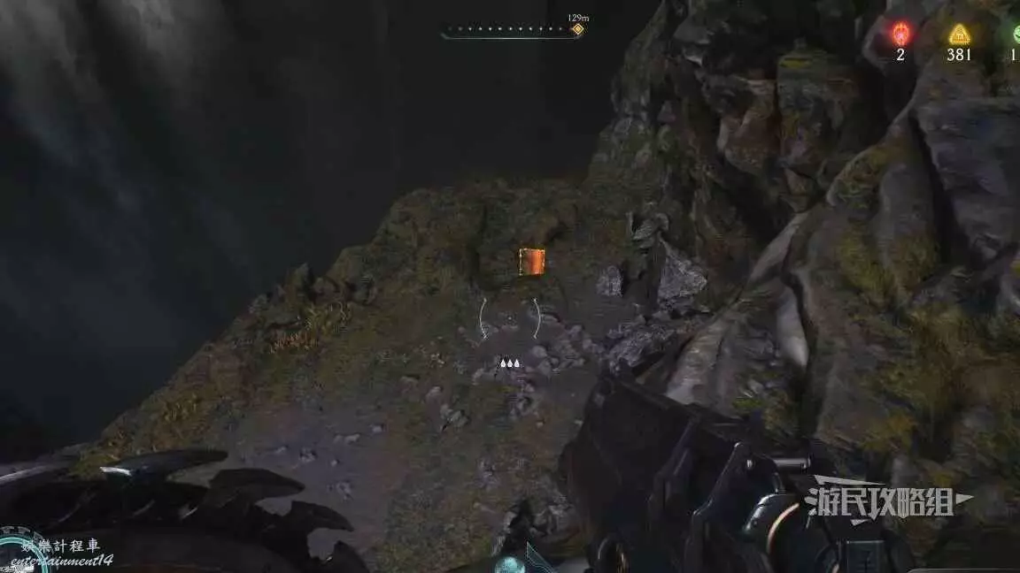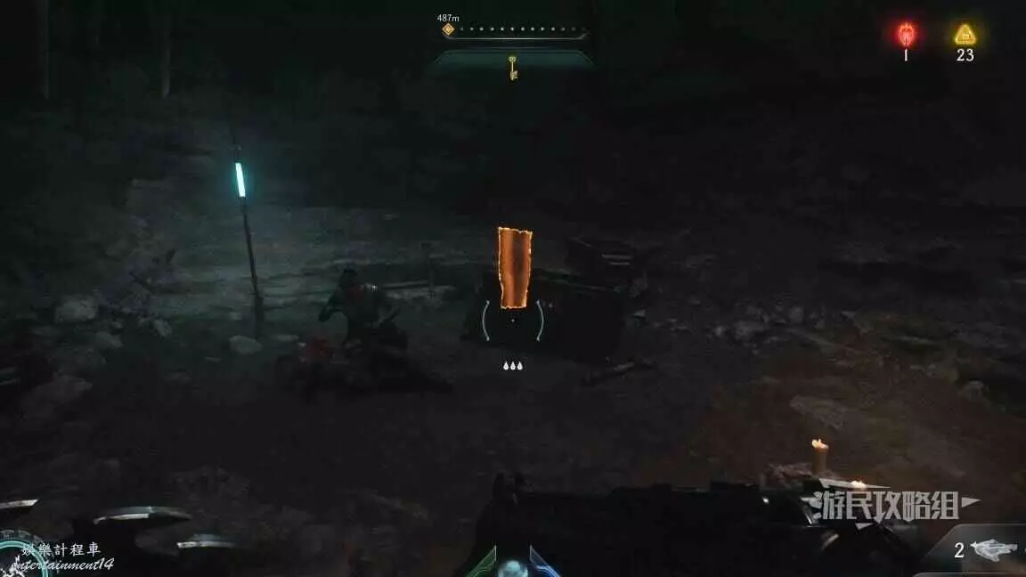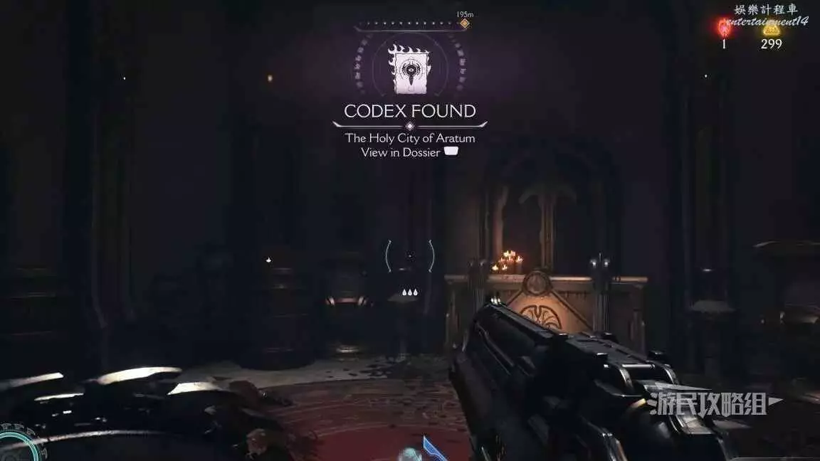 在整個關卡地圖邊緣距離淺水區不遠處的地方有一個哨兵聖壇,從聖壇繼續往地圖邊緣走可以看到一面可攀爬的牆,爬到上層即可看到黃金和這個百科,附近還有一個惡魔玩具。