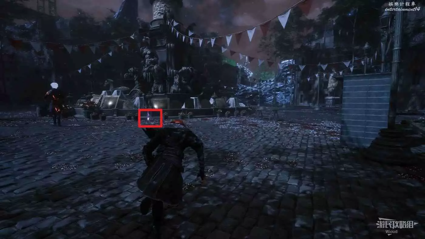 回到跳下來的位置,往左走,盡頭處可以找到一個靈光色,左側繞到中間噴泉的側後方,可在噴泉位置撿到一些道具。