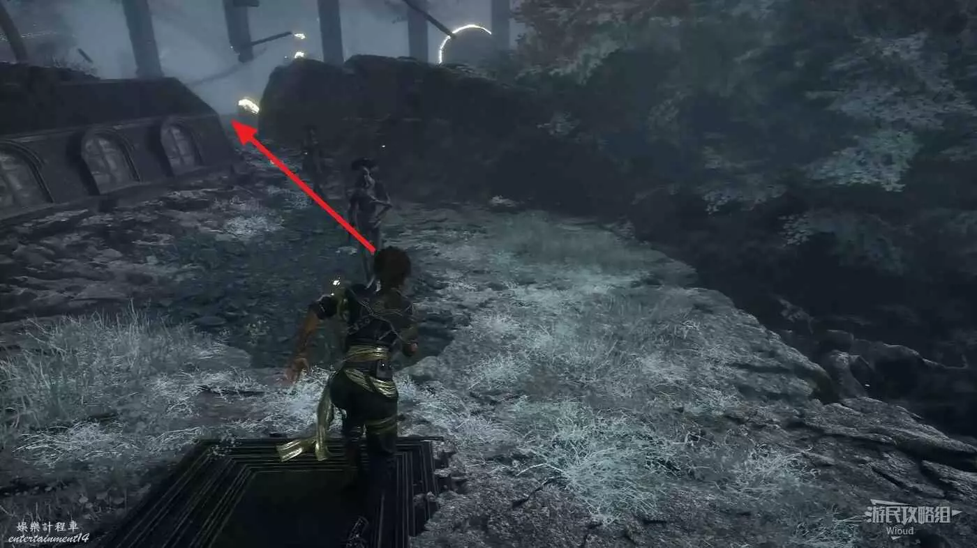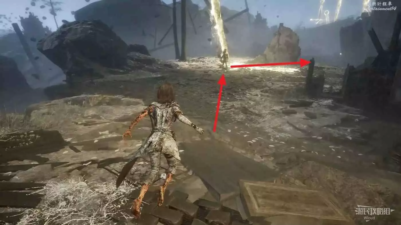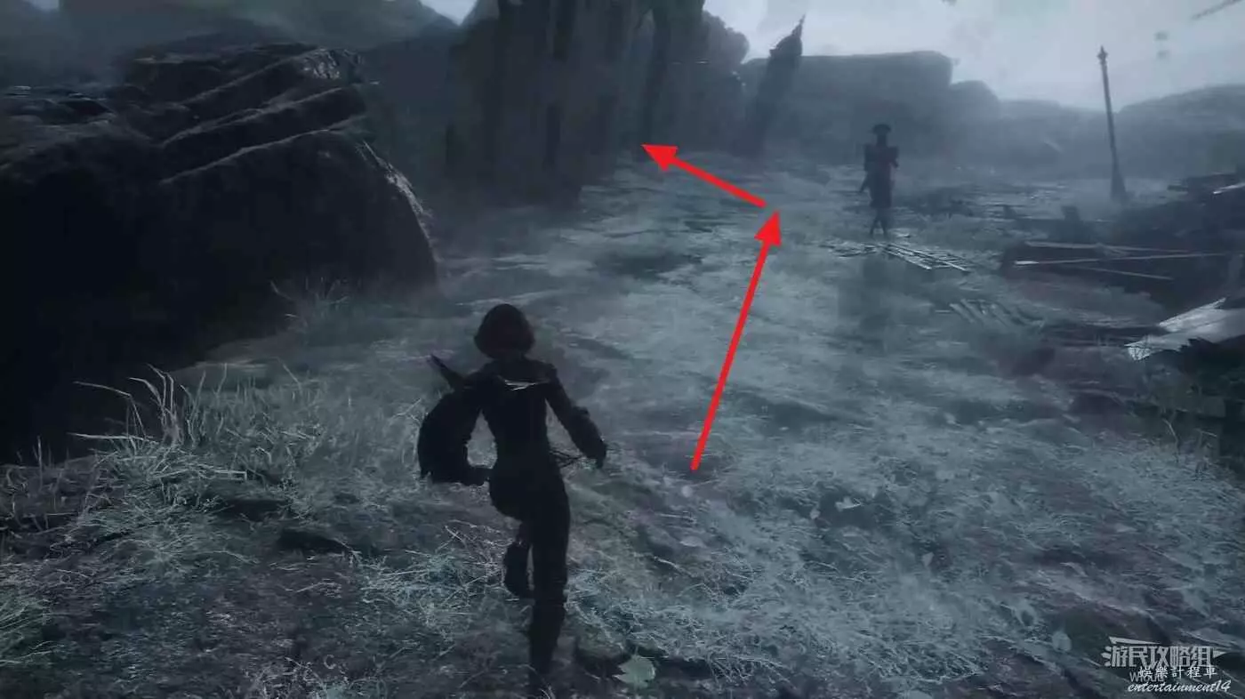 沿旗幟左側主路走,直到穿過一個斷裂的拱門遇到第一個敵人。