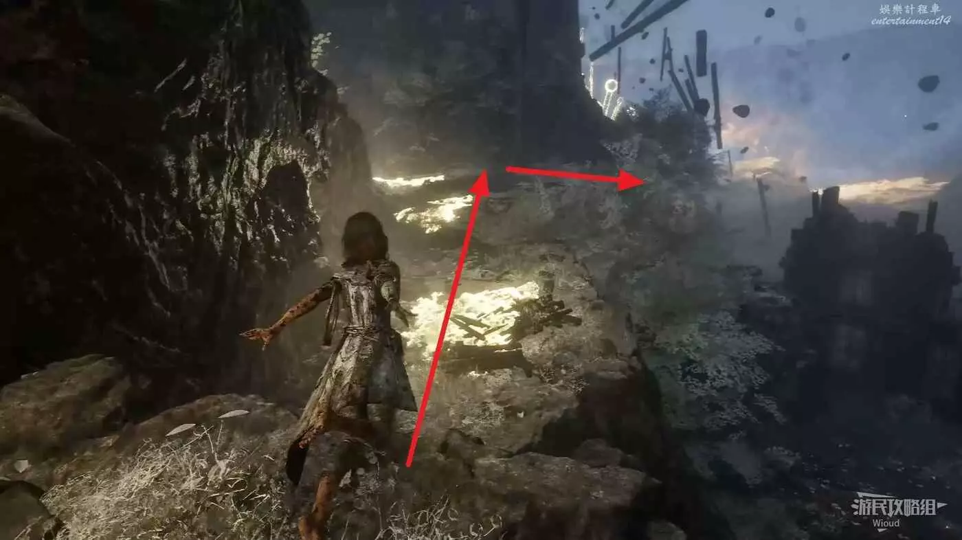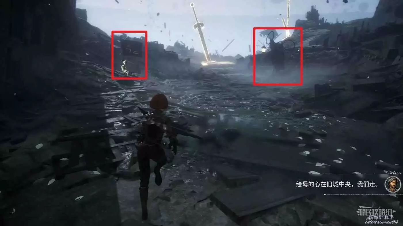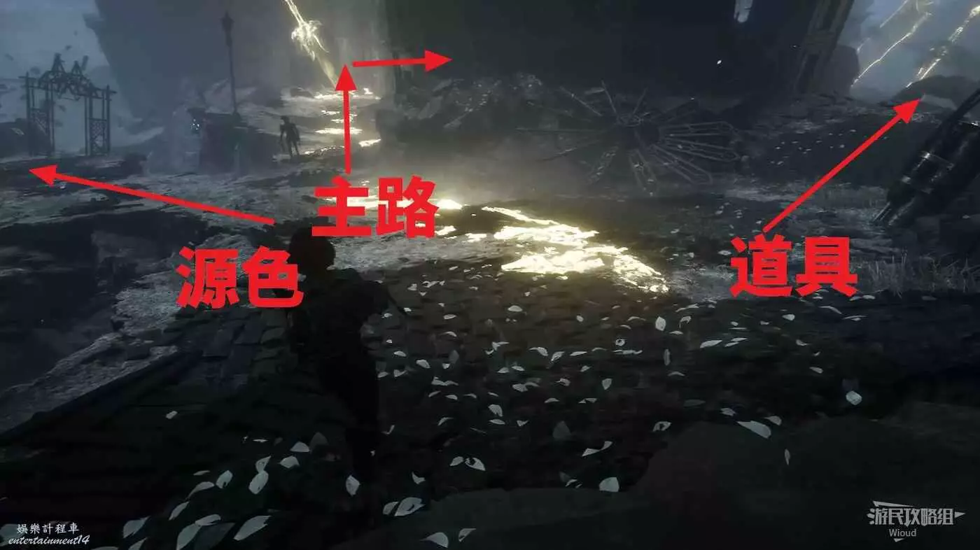 沿旗幟左側主路走,直到穿過一個斷裂的拱門遇到第一個敵人。