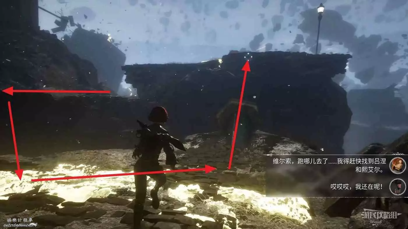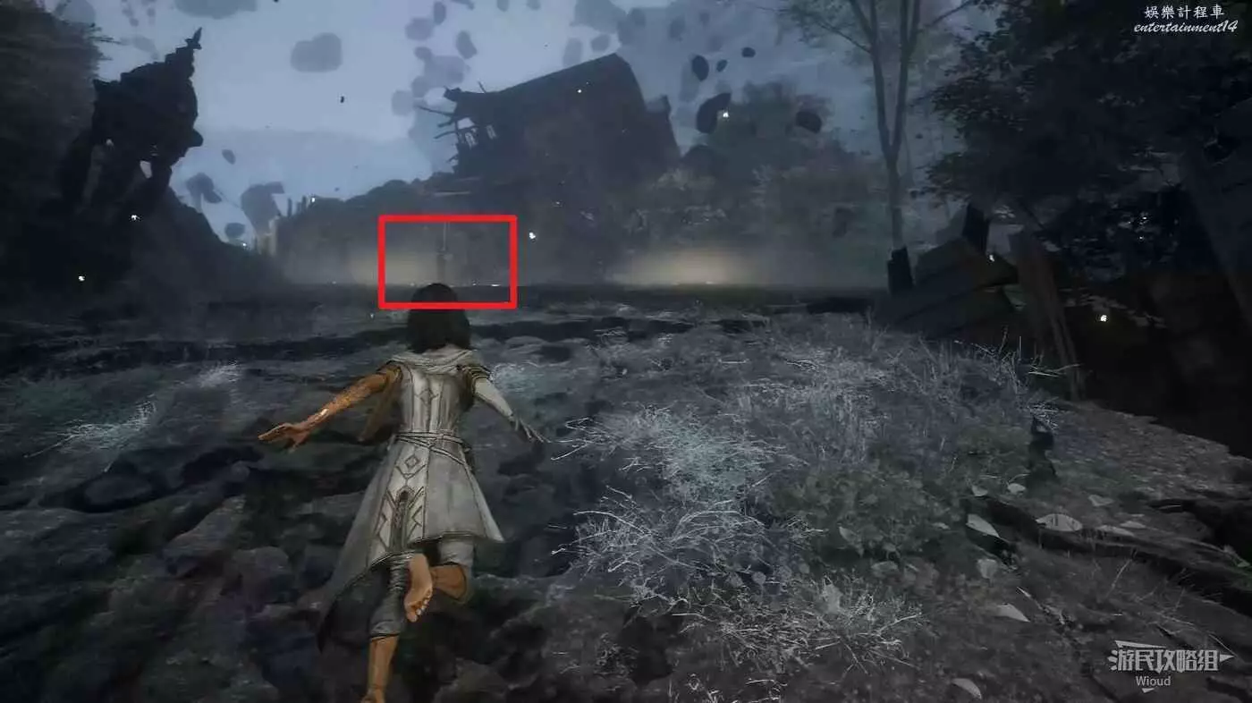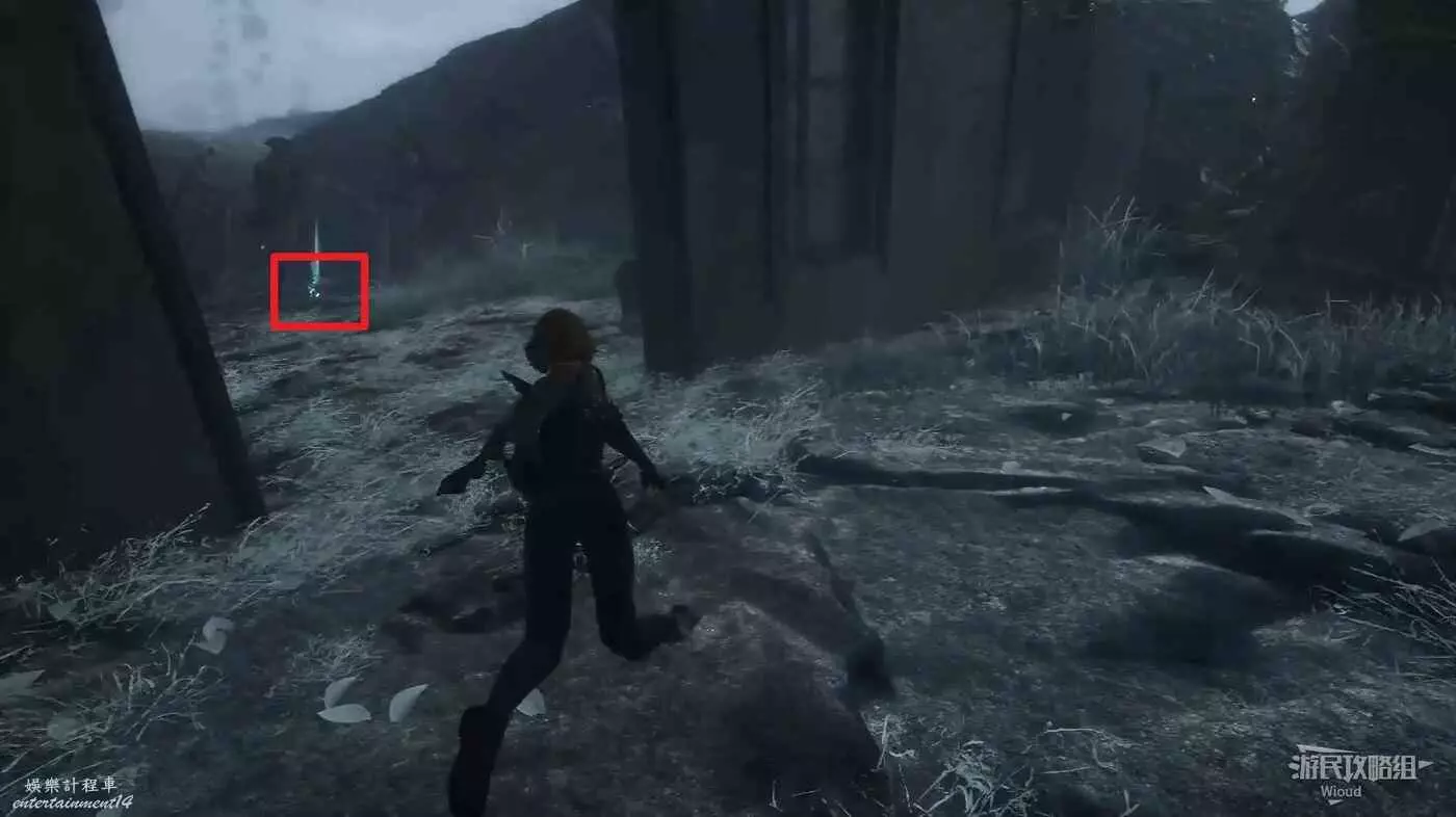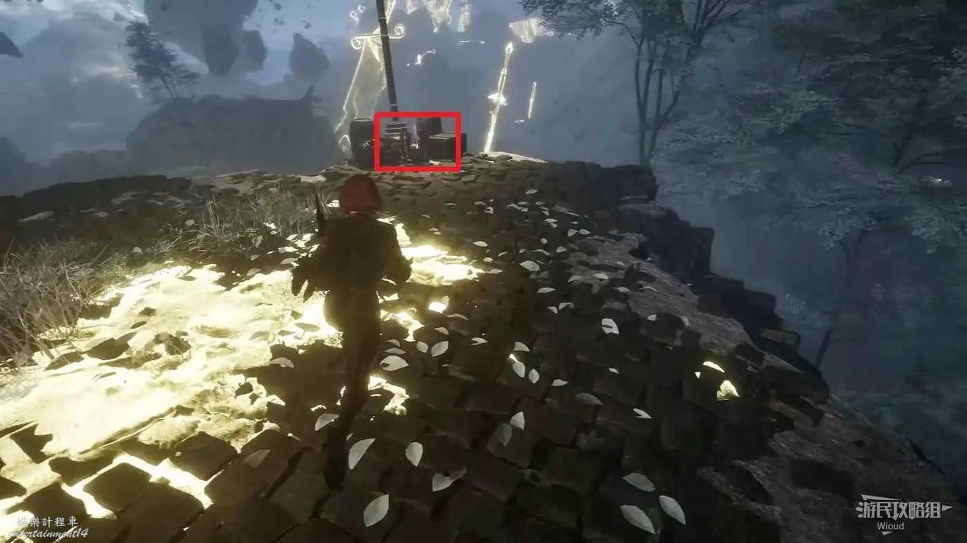 將兩個敵人擊敗後,維爾索突然不知所蹤,視角回到瑪埃爾立刻轉頭走到頭往左後方繞,通過鉤爪跳到上方平台拿一個【靈光色】。