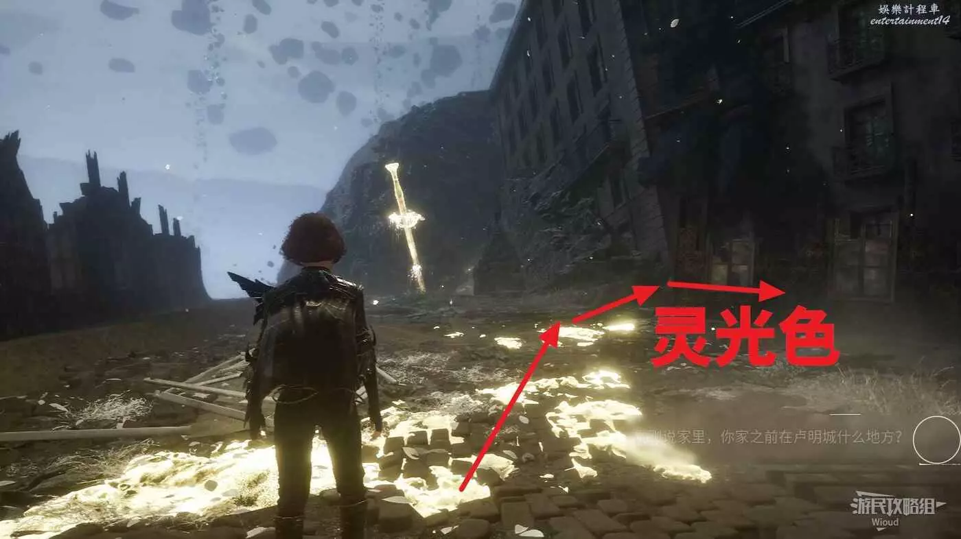 沿著右側黃色紋路的殘壁繞一下可拿到一個【靈光色】,直走到對面盡頭啟動旗幟【左街】。