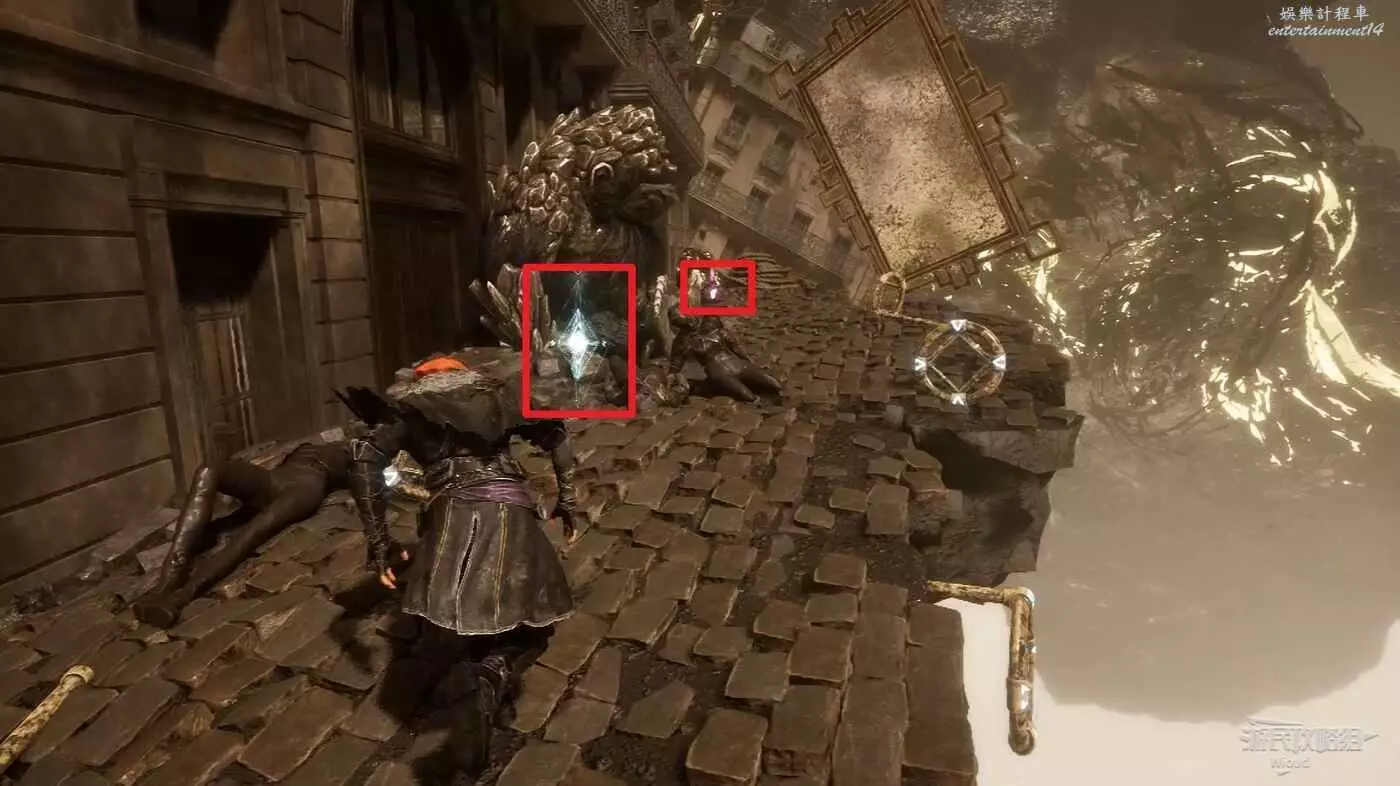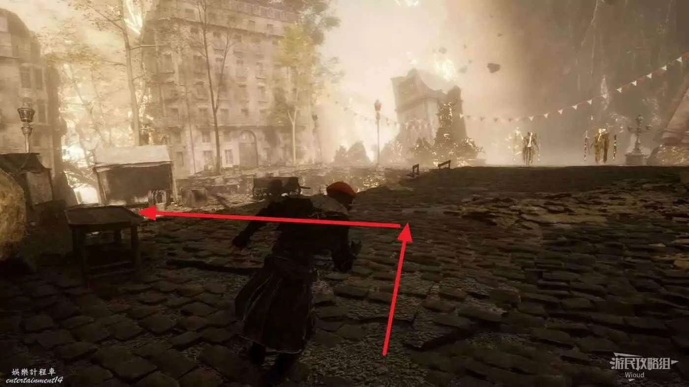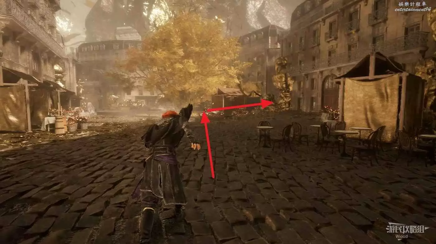 啟動起始點左側的旗幟,擊敗中間噴泉左側的敵人可升級極限格擋。