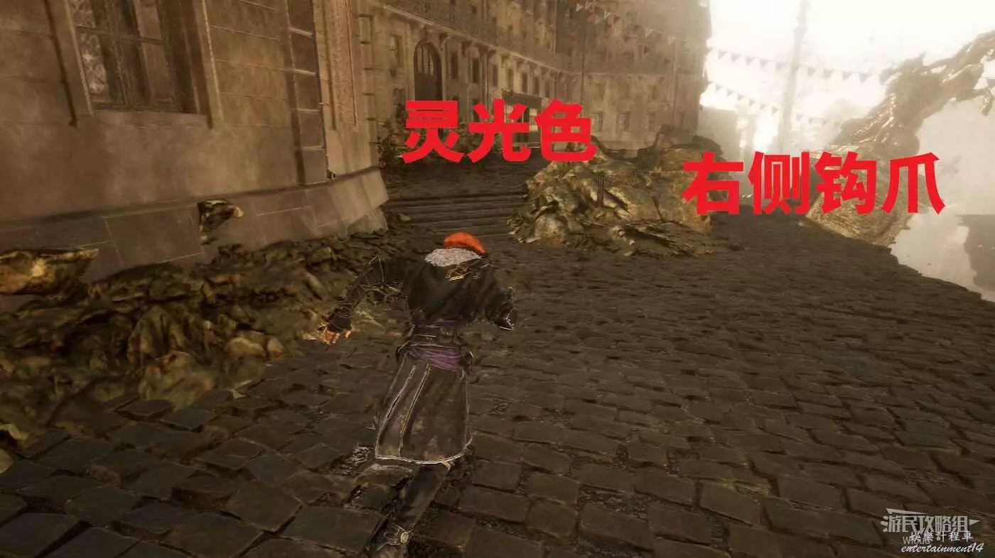 往前走,移動到盡頭使用鉤爪跳動右側平台,走到頭繼續往右跳。