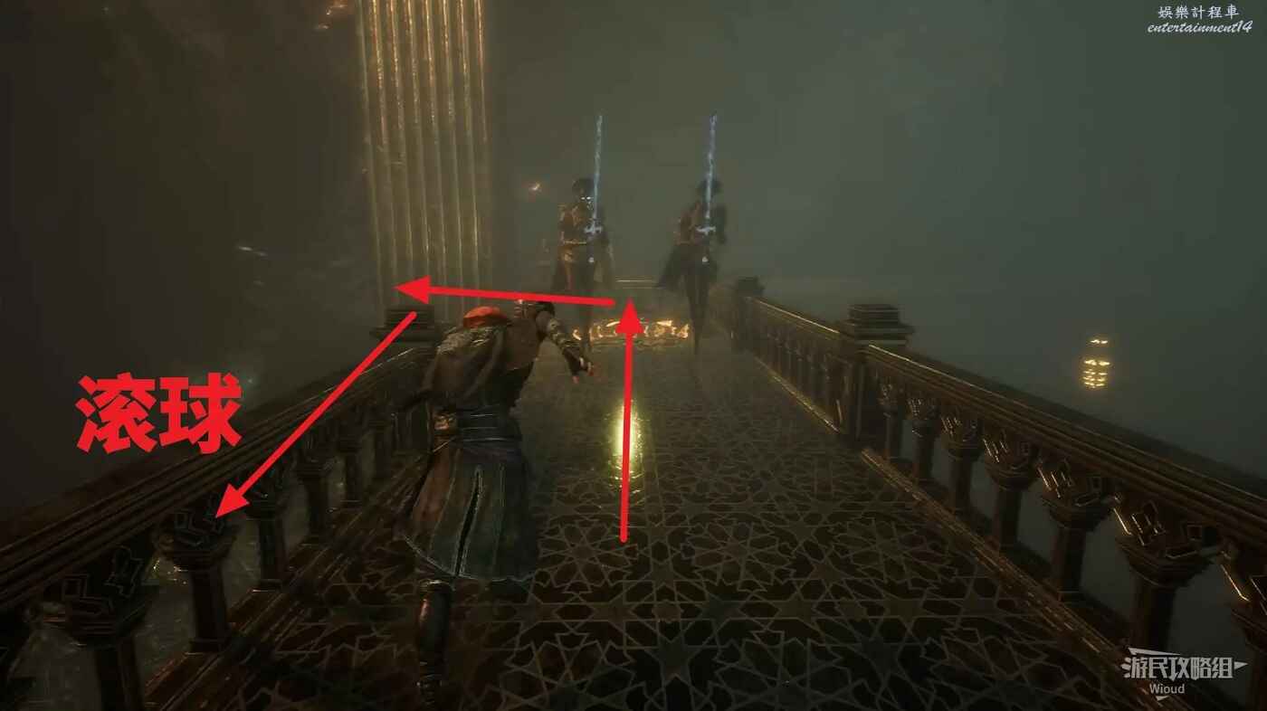 沿著樓梯走到底部,往右後方繞,可以撿一個【靈光色】,周圍的敵人基本都會升級符紋或武器,轉一圈全部打完。