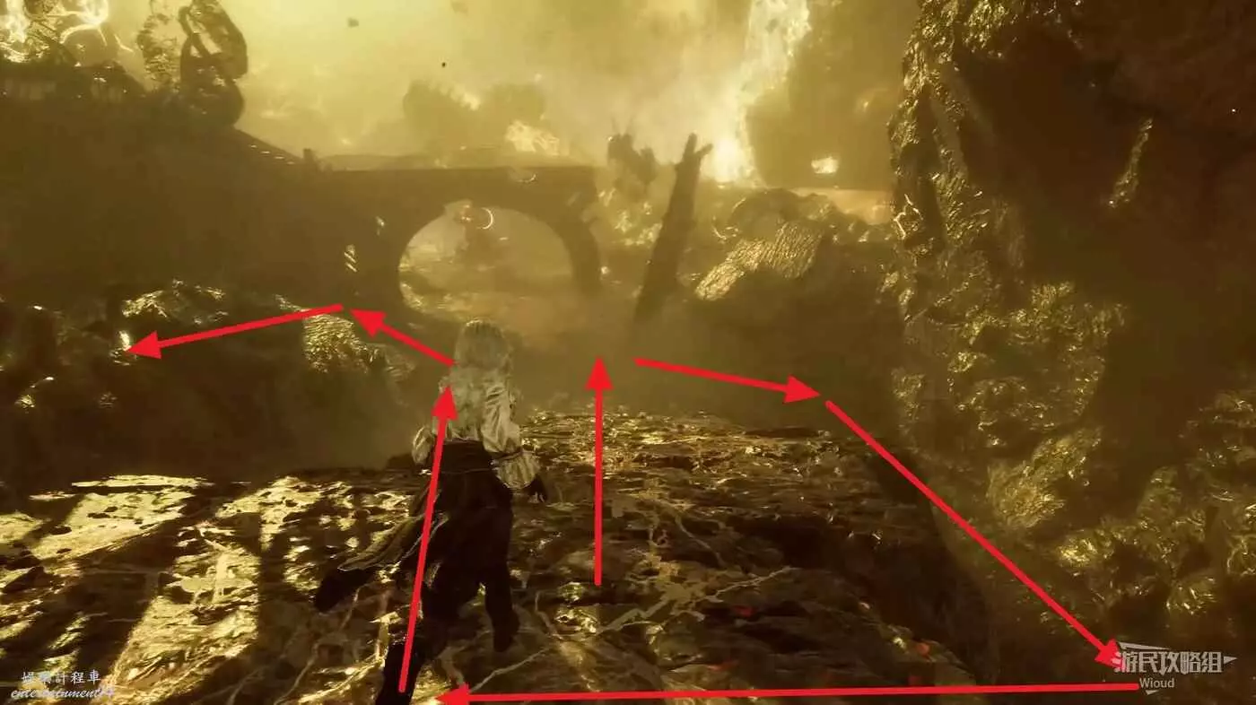 走到另一側看到一個拱門,沿著下圖路線,在下坡底下往右後方繞一圈,撿一個【靈光色】從左側通道出來往拱門左側道路走。