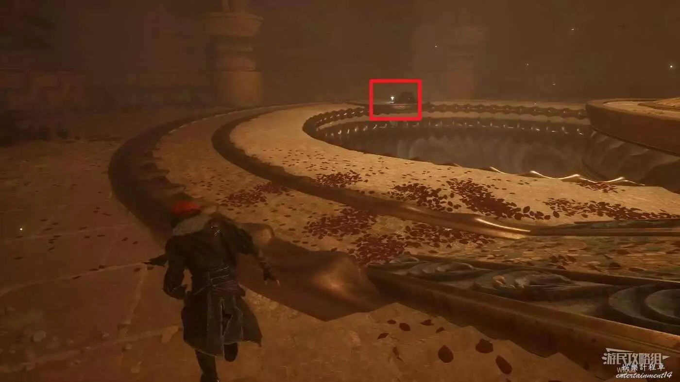 沿著梯子往下爬,通過繩索點下到底部找到第二個滾球,繼續沿路走,穿過兩個方形建築前,左側可以撿到一個【靈光色】。