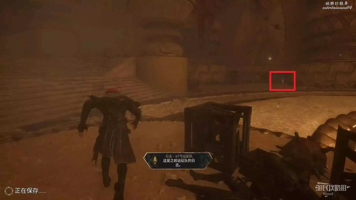 回到旗幟的位置往前直走,盡頭乘坐電梯到下一個區域,重點沿著兩側樓梯下去可以看到對面有個日誌標點,靠近拾取【67號遠征隊日誌】。