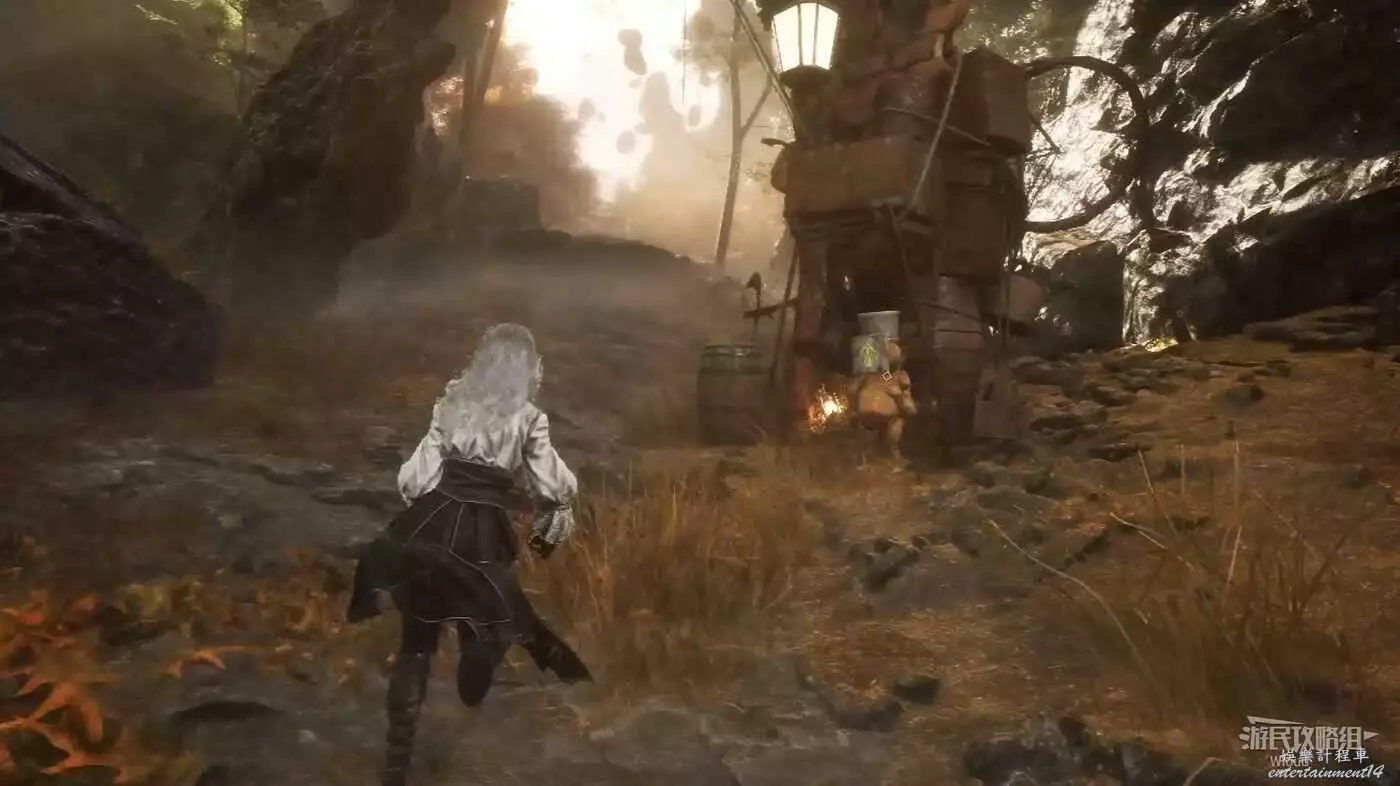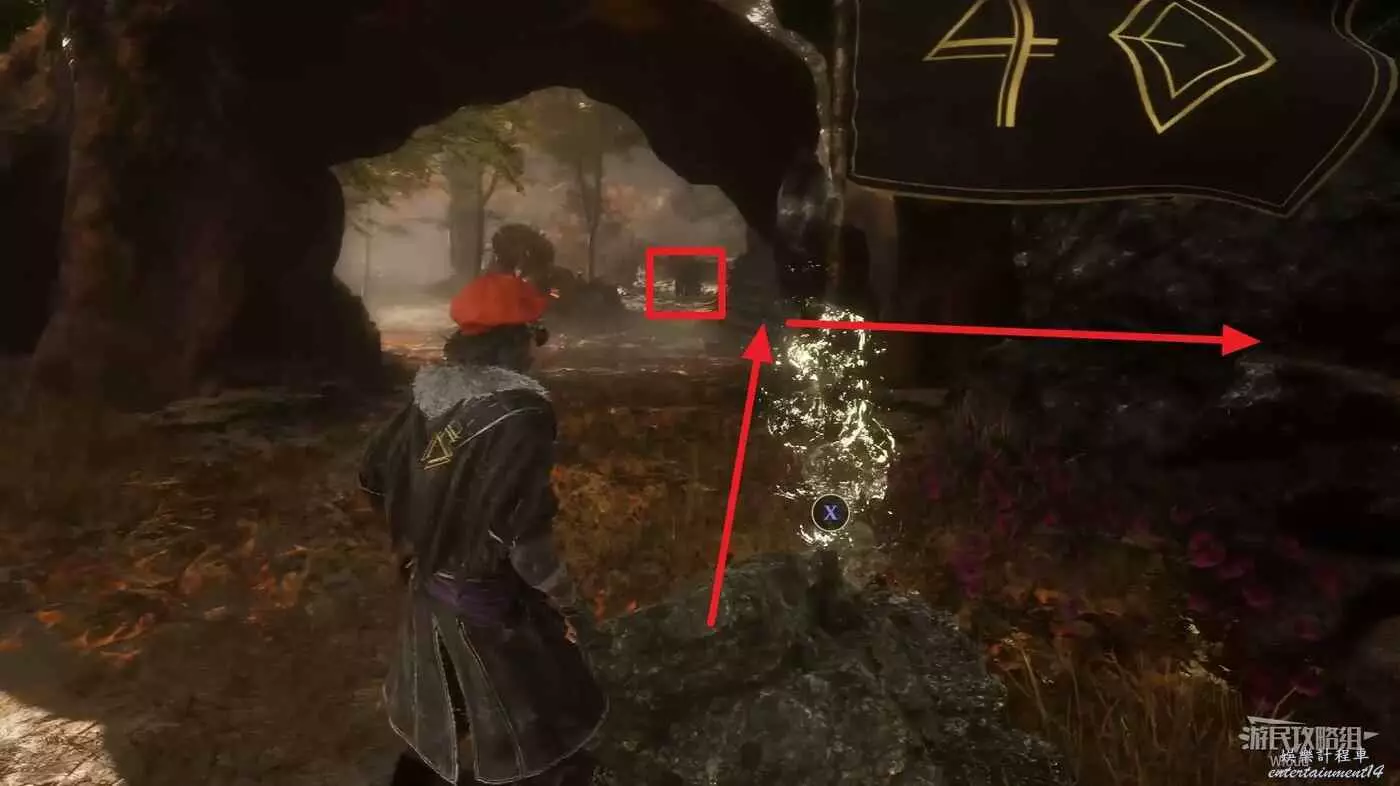 繼續沿路走到第一個旗幟的位置,然後與下圖紅框所示位置的暗影男孩對話觸發個劇情,這段劇情有判定,必須觸發!