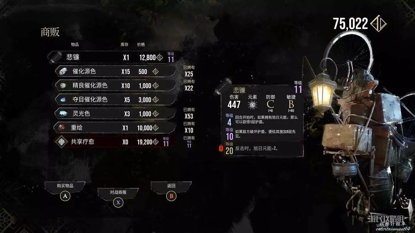 旗幟前方有個刷頭精商人,此處可購買符紋【共用療愈】與武器【悲鐮】。