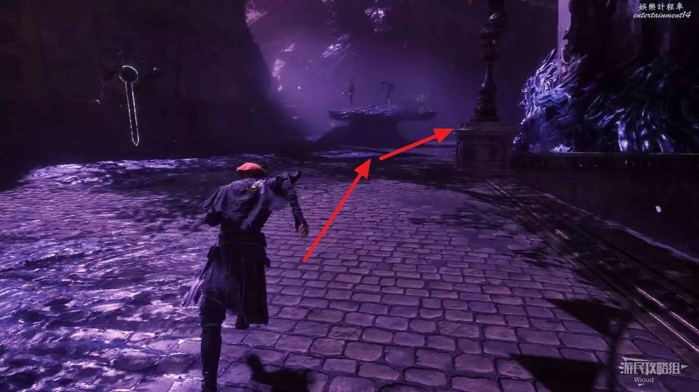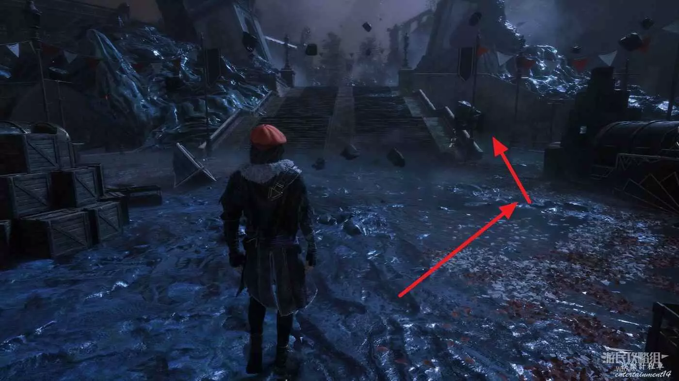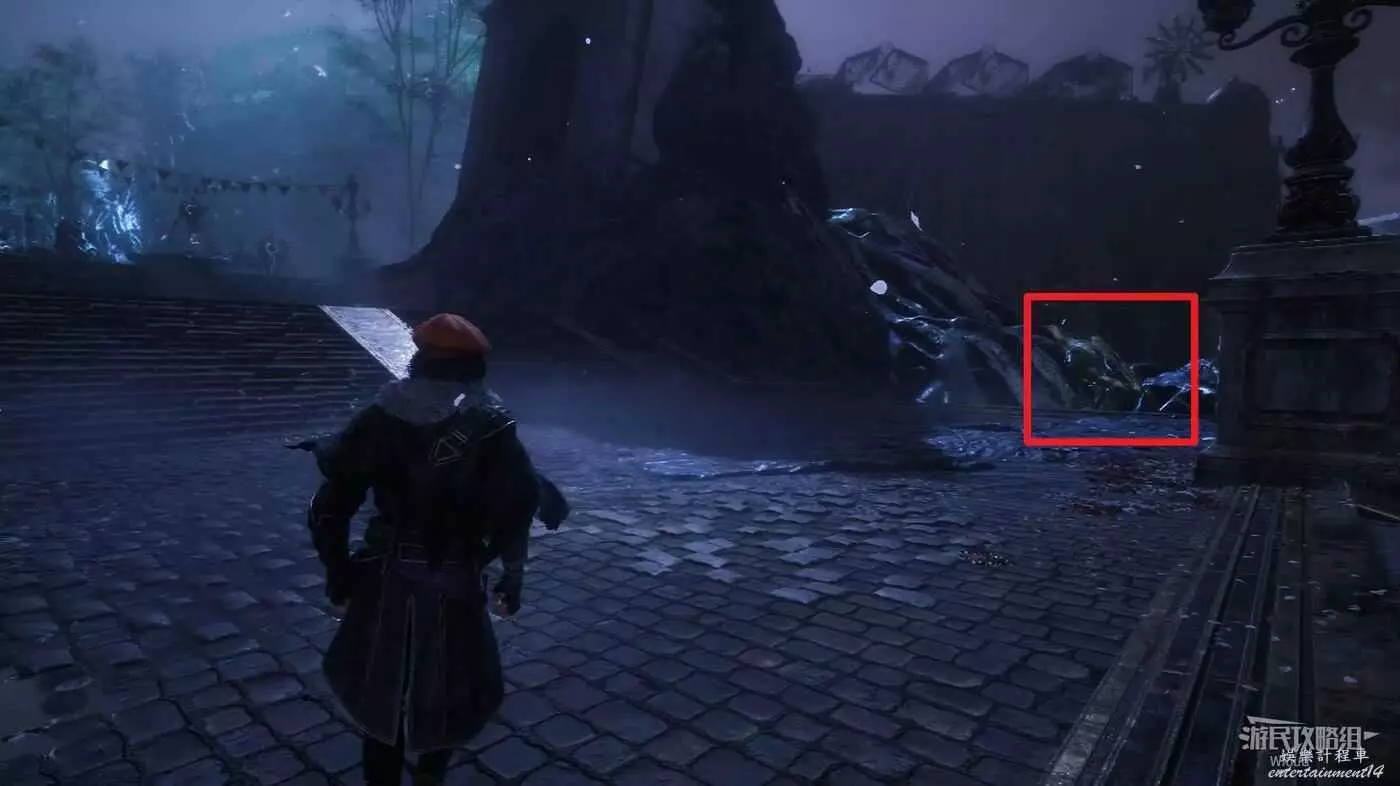 回到跳下來的位置,往左走,盡頭處可以找到一個靈光色,左側繞到中間噴泉的側後方,可在噴泉位置撿到一些道具。