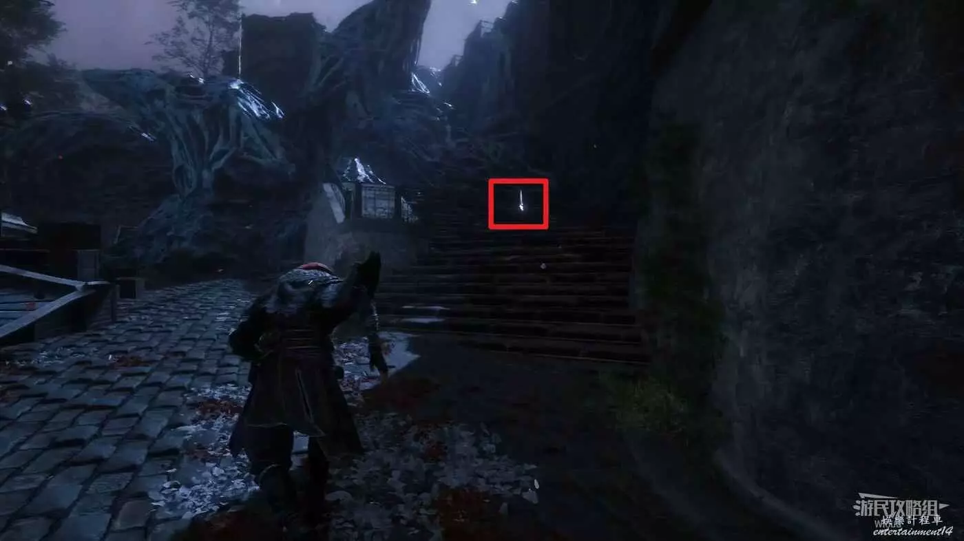 繼續往裡走,爬繩索來到廣場底部,往右走,可在第一個凹口的裡找到一個【靈光色】。