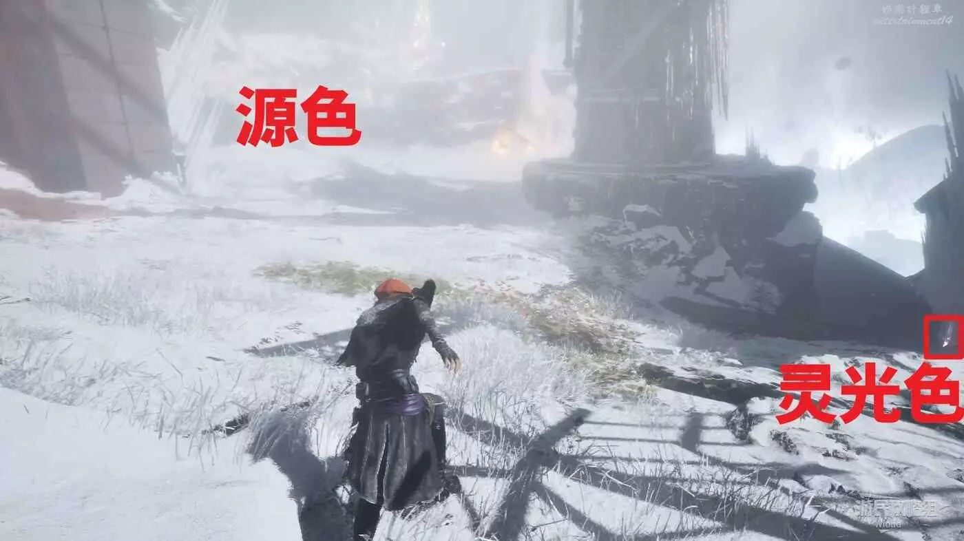 回到十字路口往右走,注意右側有個衍生出去的通道,可撿到一個【靈光色】,左側上坡有怪物的位置,走到頭可撿到一些源色。