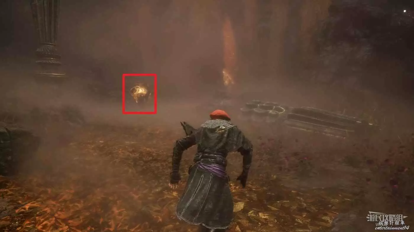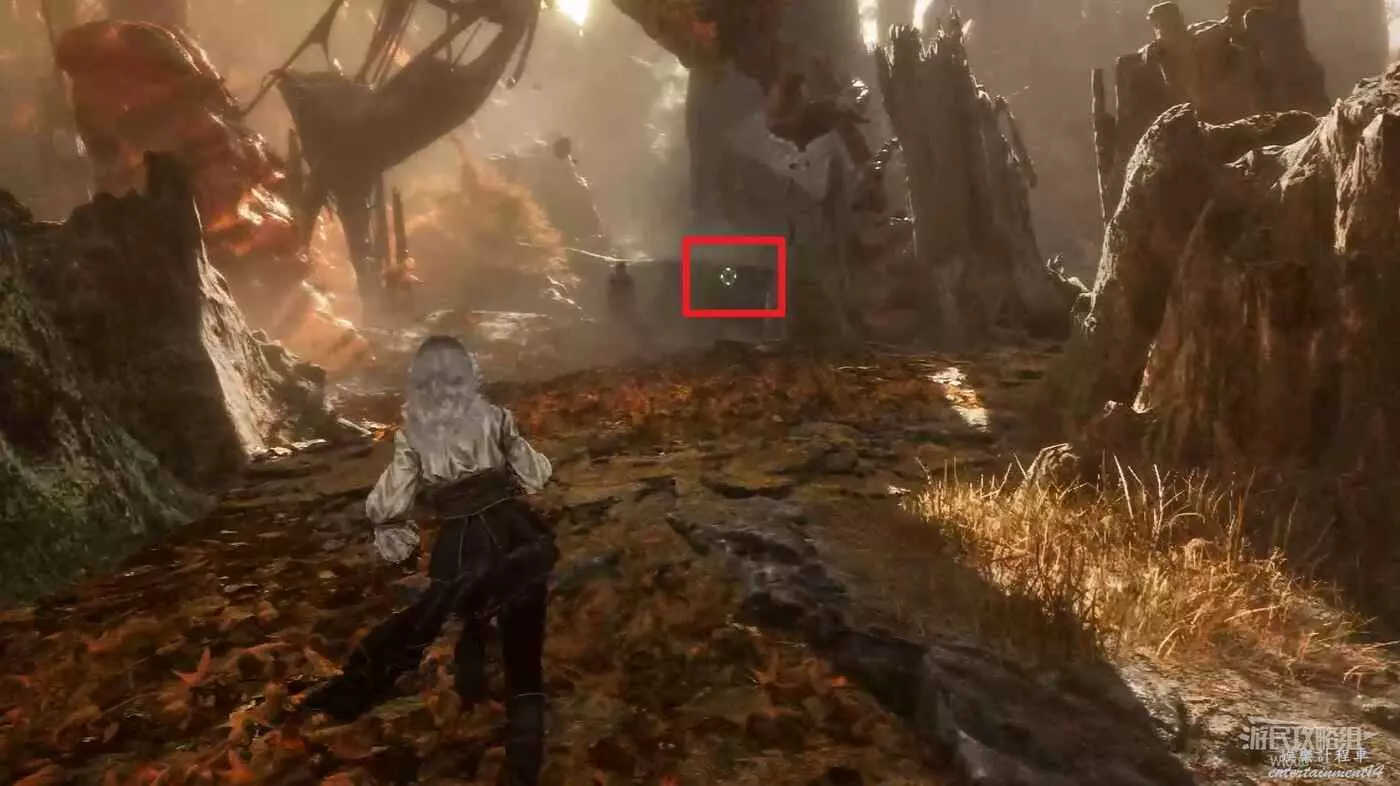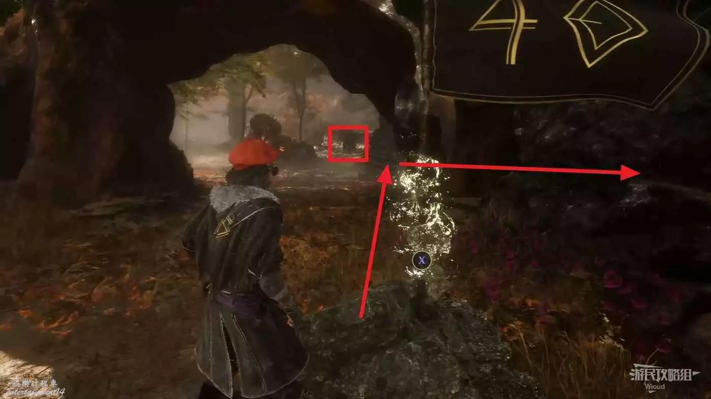 繼續沿路走到第一個旗幟的位置,然後與下圖紅框所示位置的暗影男孩對話觸發個劇情,這段劇情有判定,必須觸發!