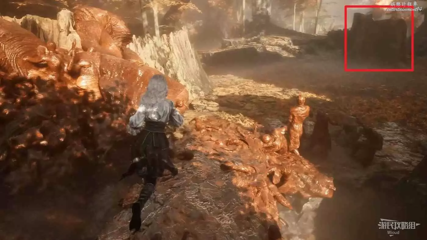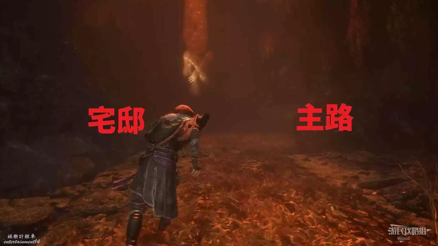 回到倒掛人位置,往右沿路一直走,直到跳下一個過道遇到一個巨大敵人。