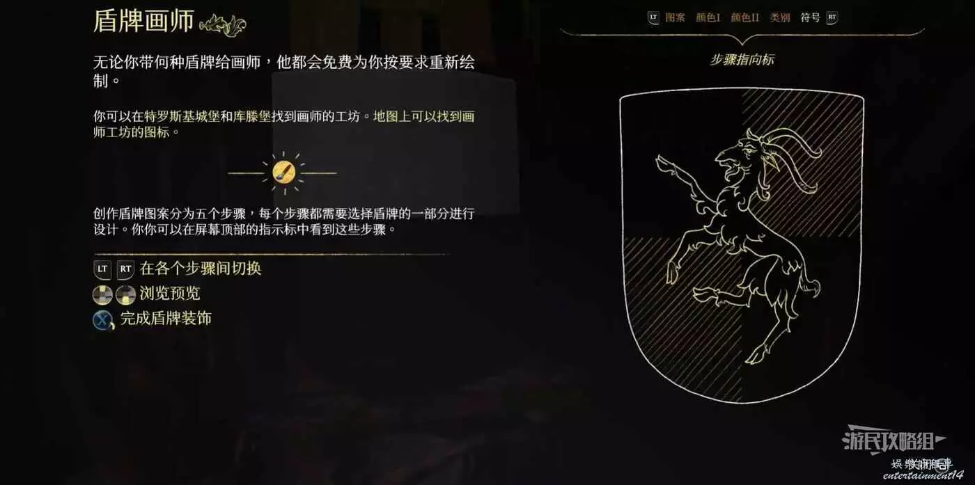 進入自訂介面後即可自由選擇定製圖案,分別可以定製:圖案、顏色1和顏色2、類別和符號五種項目。確定好所有內容後根據右下角按鍵提示選擇【接受改動】即可完成定製。首次定製由於維頁塔欠亨利人情,此次定製為免費,之後可以隨時返回繪製新的盾牌,也可以恢復原始圖案。