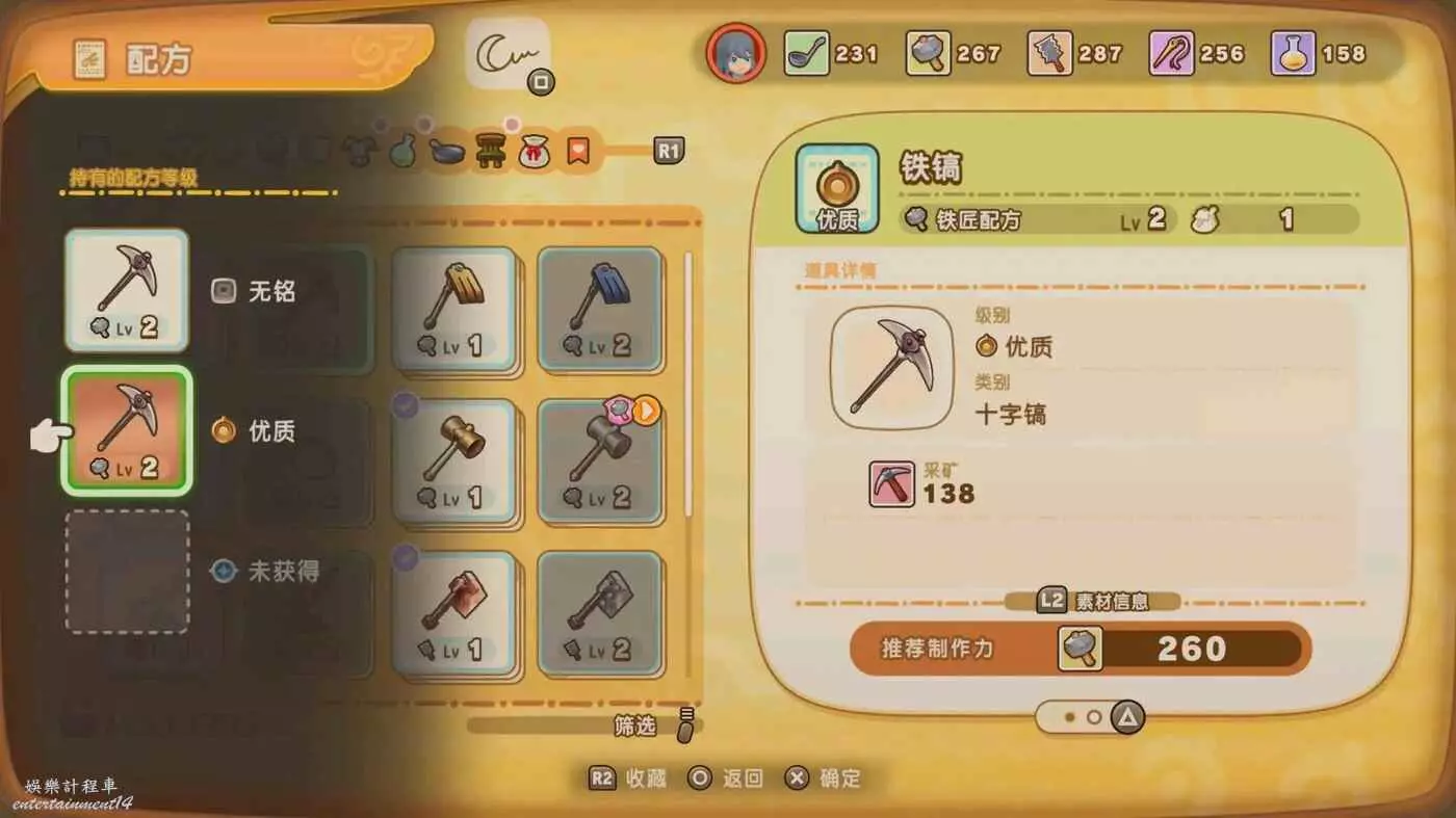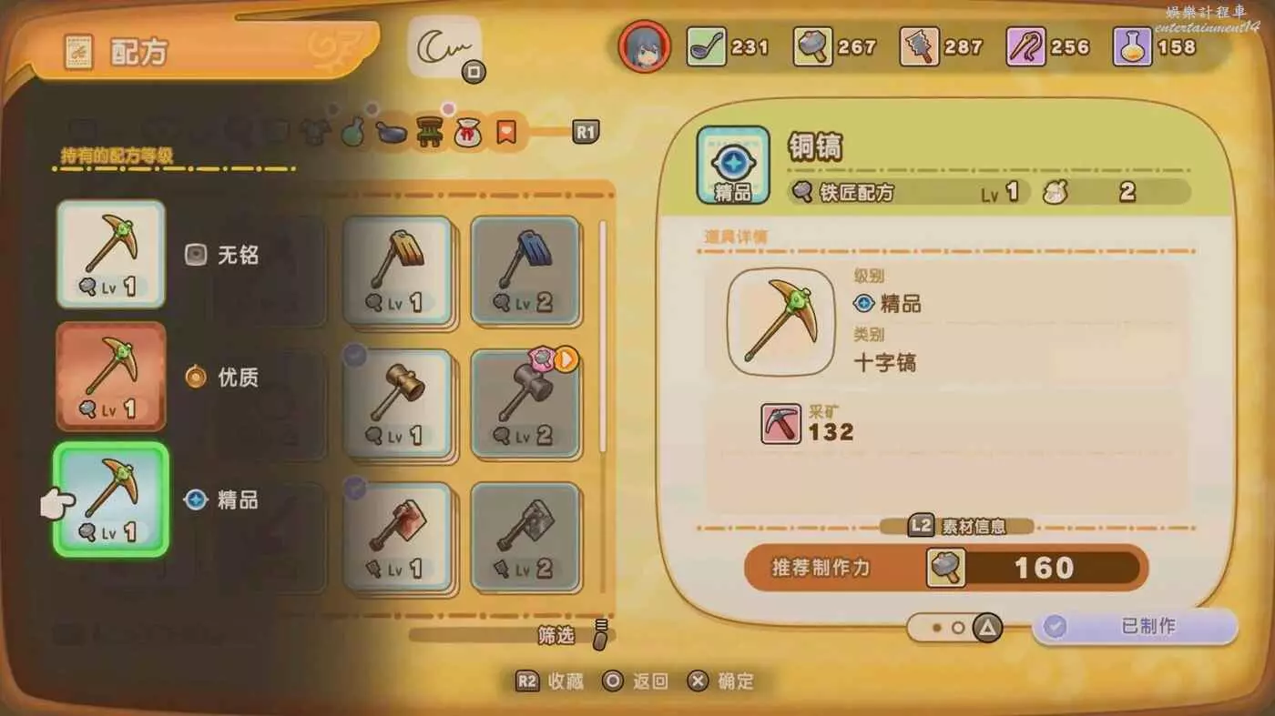不過我是覺得繼續用銅鎬就好,解鎖鐵稿的時候也解鎖了精品等級的銅鎬,和鐵鎬數值差不多,但製作力要求比鐵鎬低多了,更容易極大成功。