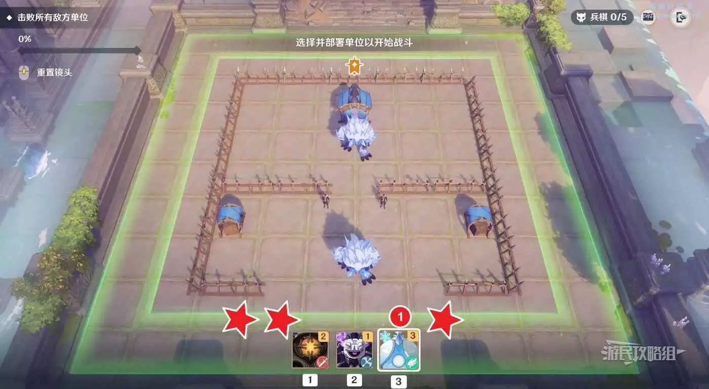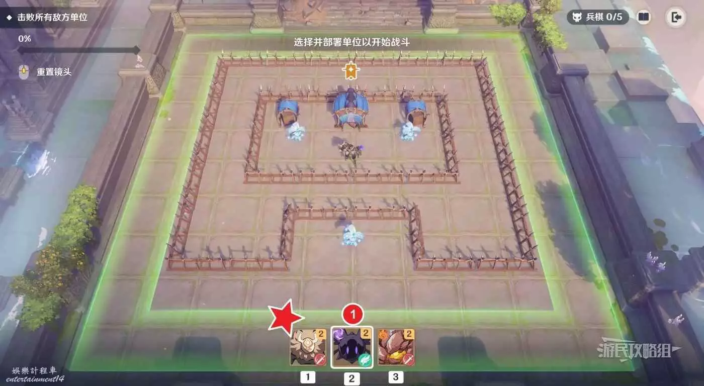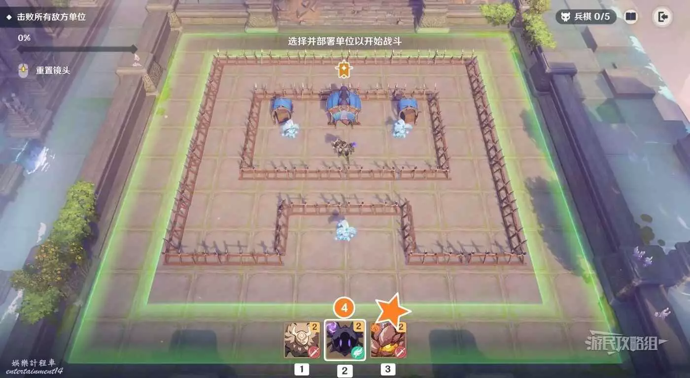 本關的關鍵點是用遺跡守衛扛傷害並造成AOE傷害,部署單位時爆彈丘丘人要儘量安排在遺跡守衛後方(或在遺跡守衛出發並吸引火力後再部署爆彈丘丘人)。還有一種方式是可以將單位部署在螢幕上方,但不建議這樣部署,否則會剩下比較棘手的史萊姆,還是優先解決能造成傷害的敵方單位。