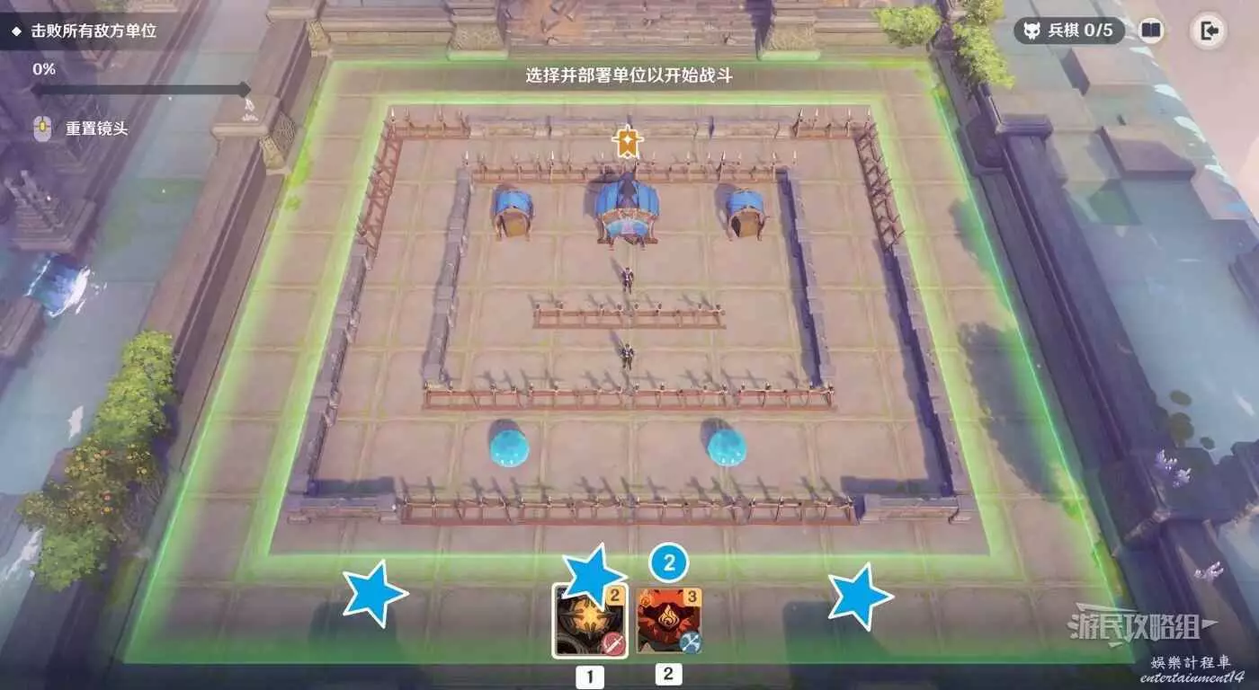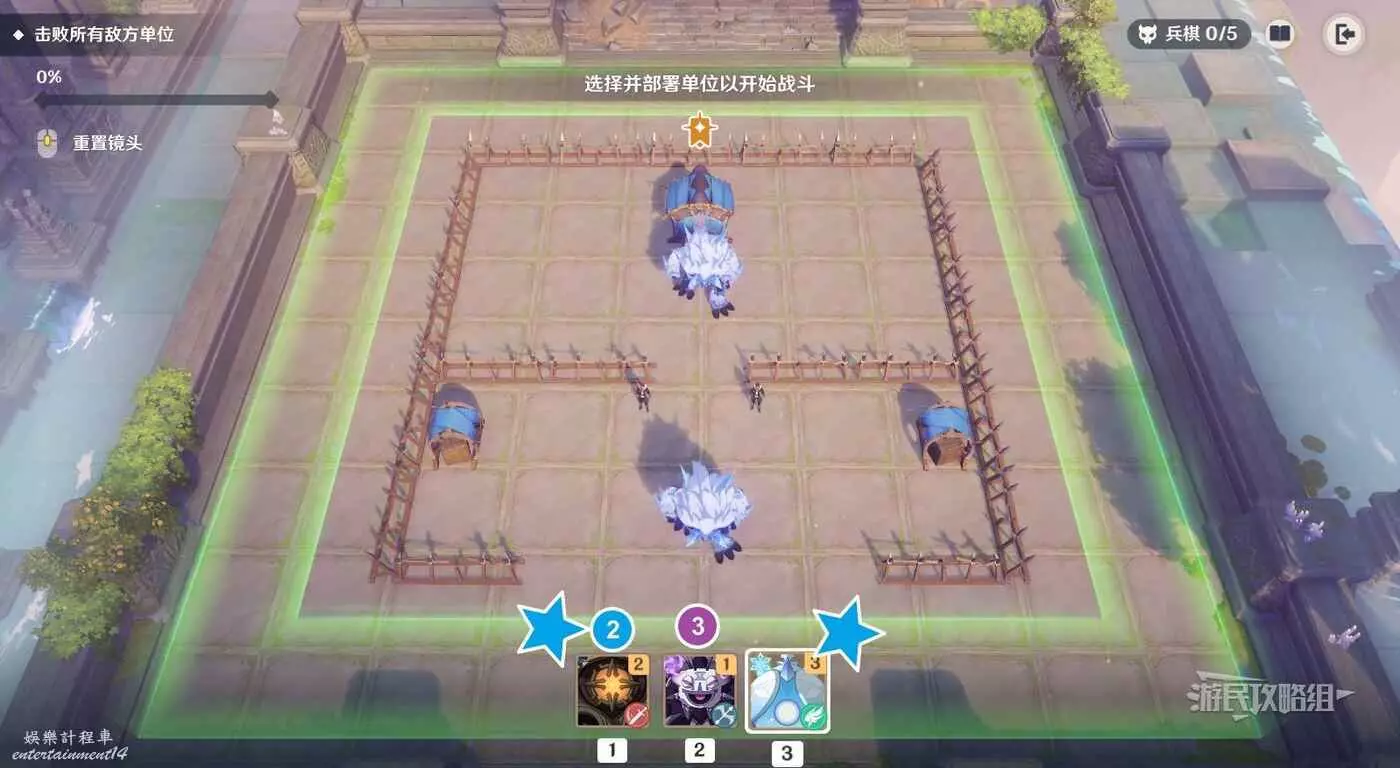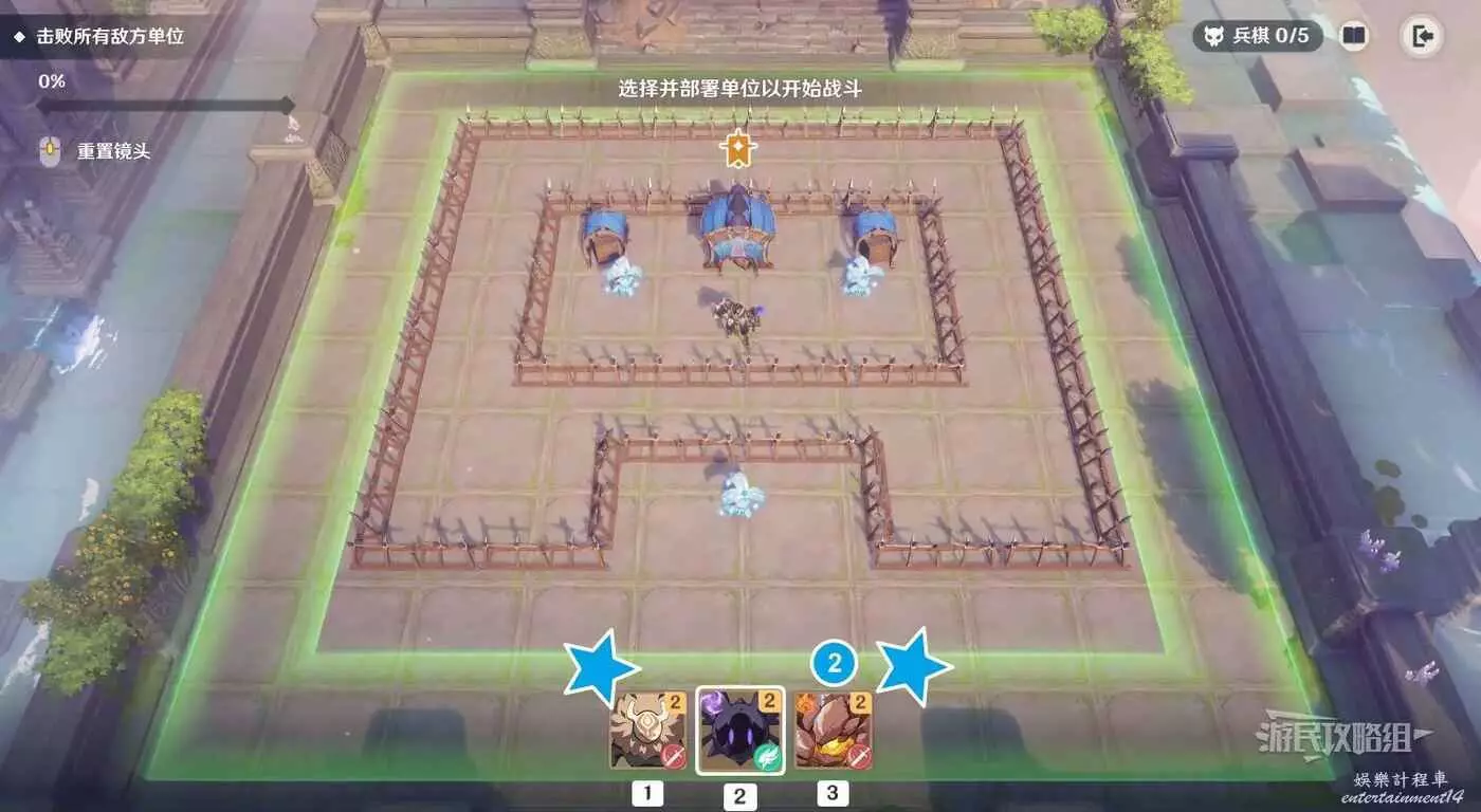 本關的關鍵點是用遺跡守衛扛傷害並造成AOE傷害,部署單位時爆彈丘丘人要儘量安排在遺跡守衛後方(或在遺跡守衛出發並吸引火力後再部署爆彈丘丘人)。還有一種方式是可以將單位部署在螢幕上方,但不建議這樣部署,否則會剩下比較棘手的史萊姆,還是優先解決能造成傷害的敵方單位。