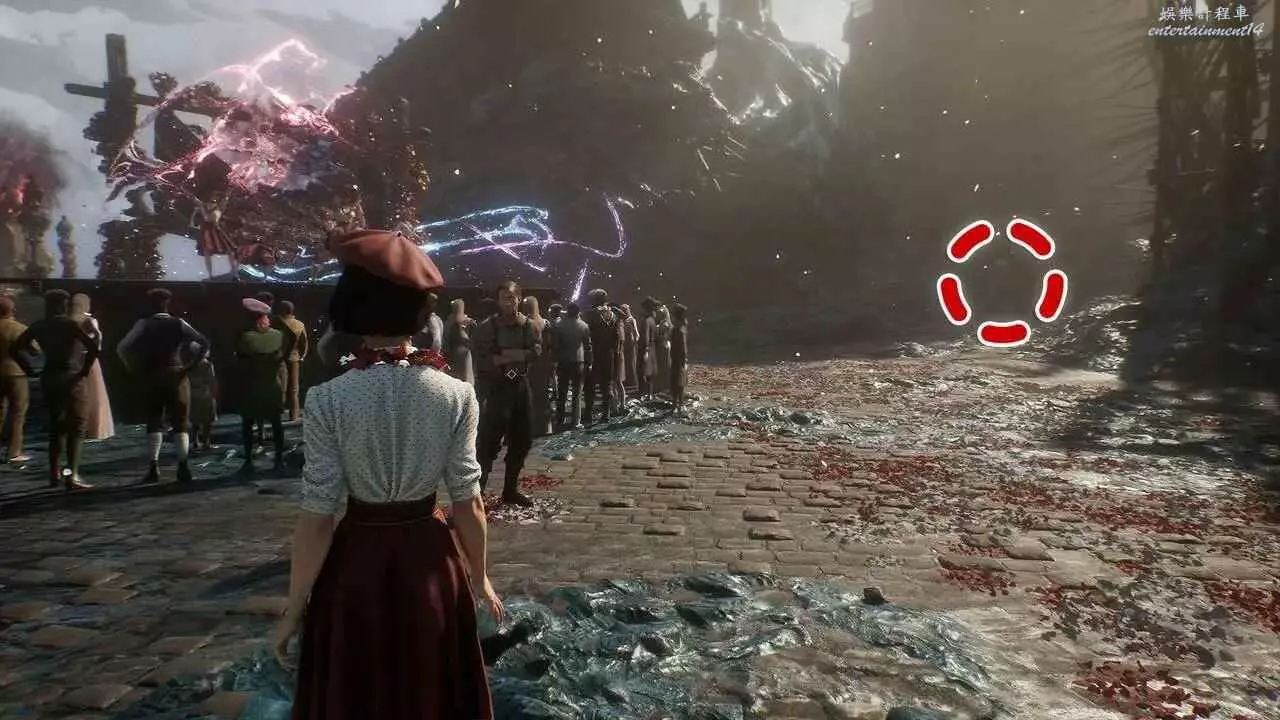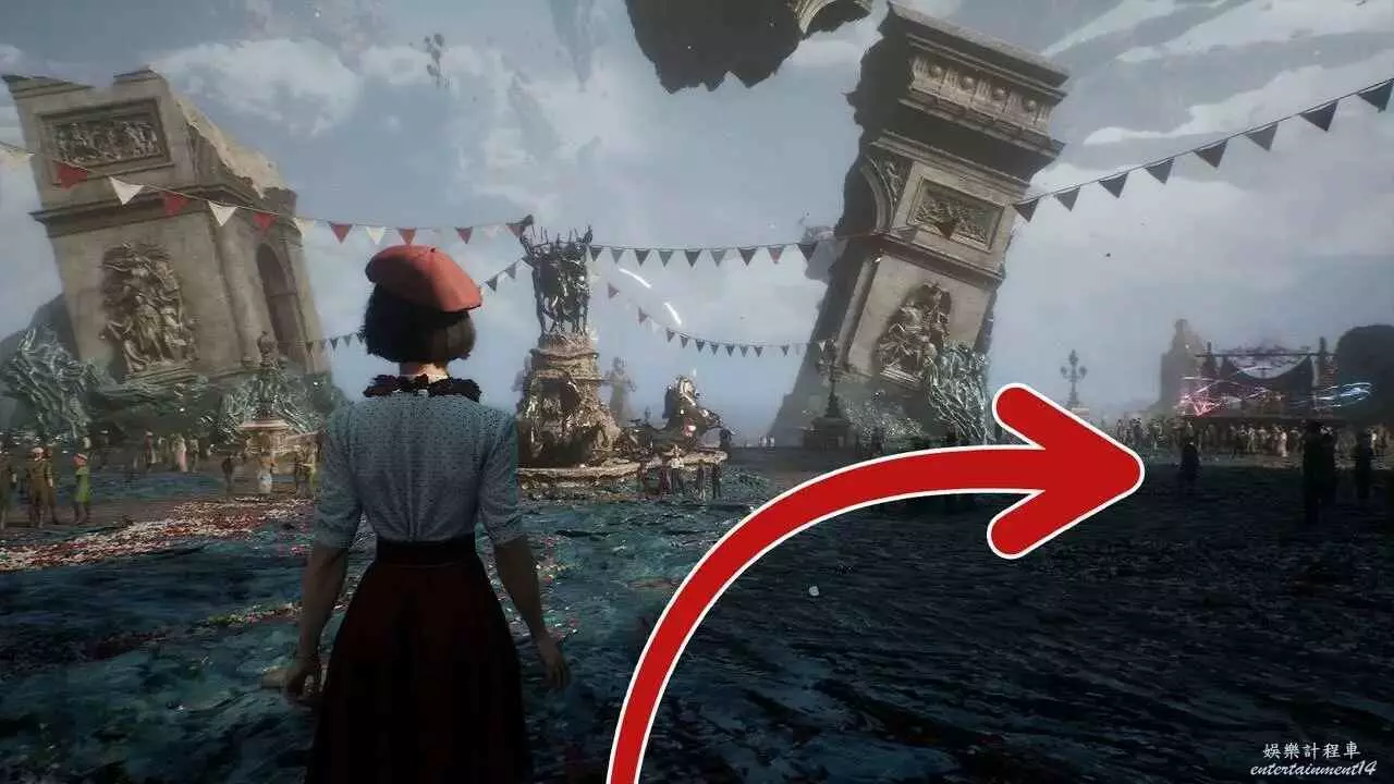 在序章路名稱,跟隨主線經路徑護送索菲前往港口,在穿過花市靠近港口時進入一片開闊區域,周圍有許多等待慶典開始的NPC。面對裂開的凱旋門和噴泉往右走。