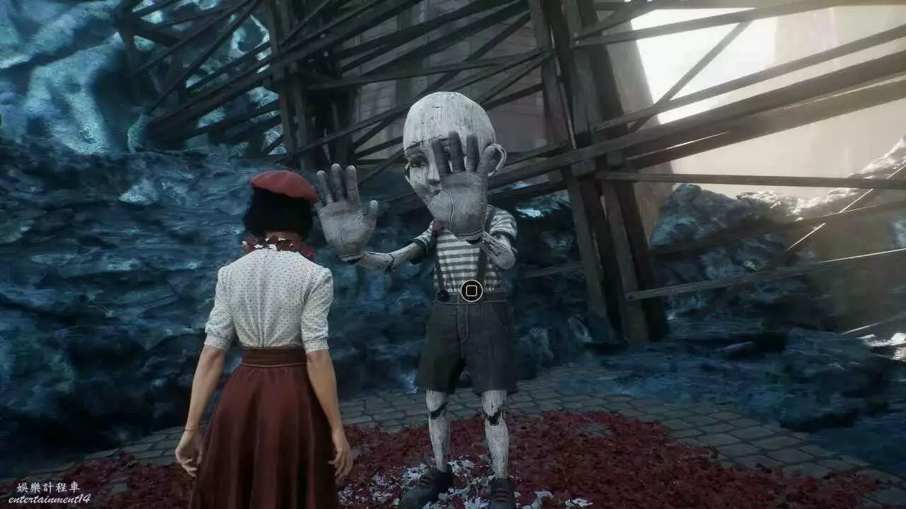 朝舞台方向看然後往右轉,即可在陰暗的角落裡看到一隻默偶。