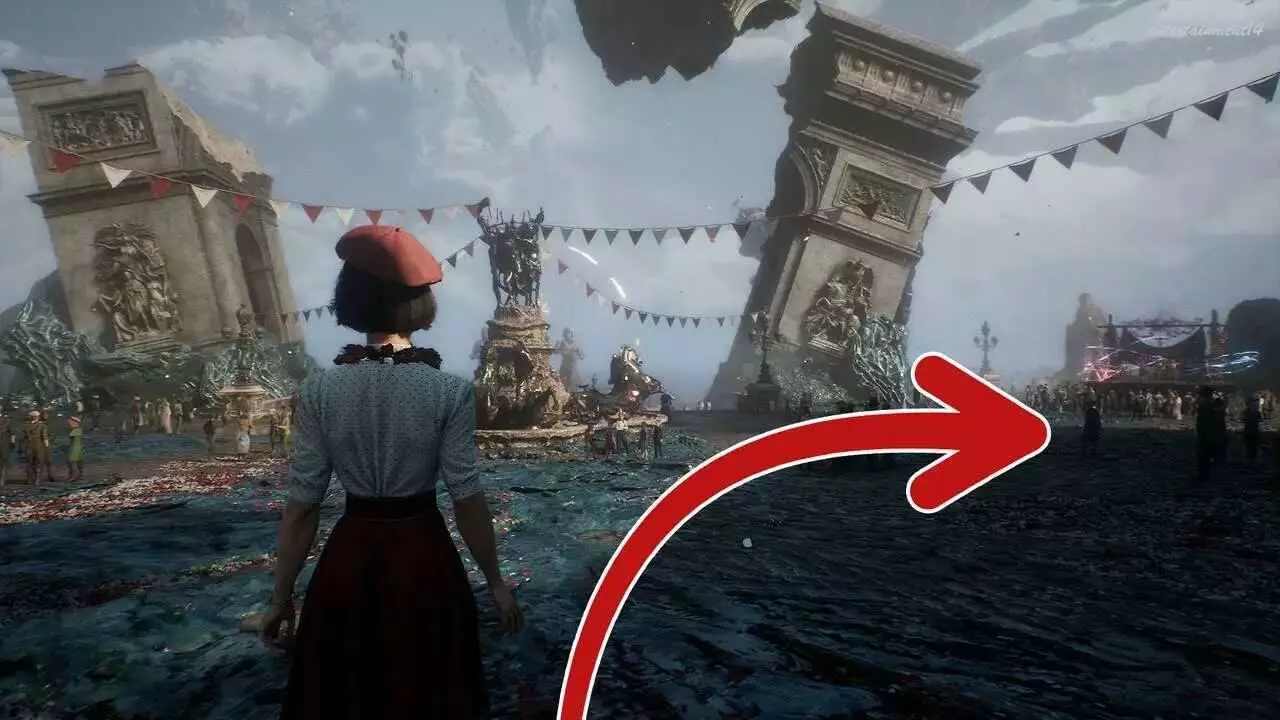 在序章路名稱,跟隨主線經路徑護送索菲前往港口,在穿過花市靠近港口時進入一片開闊區域,周圍有許多等待慶典開始的NPC。面對裂開的凱旋門和噴泉往右走。