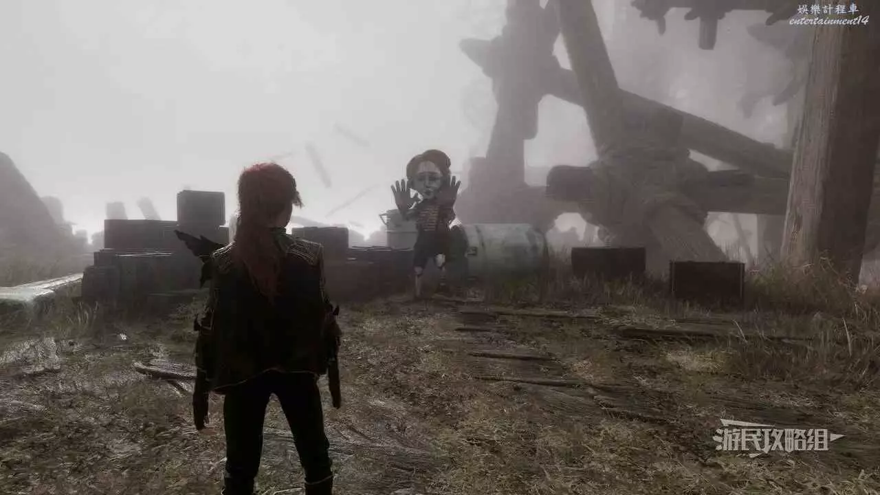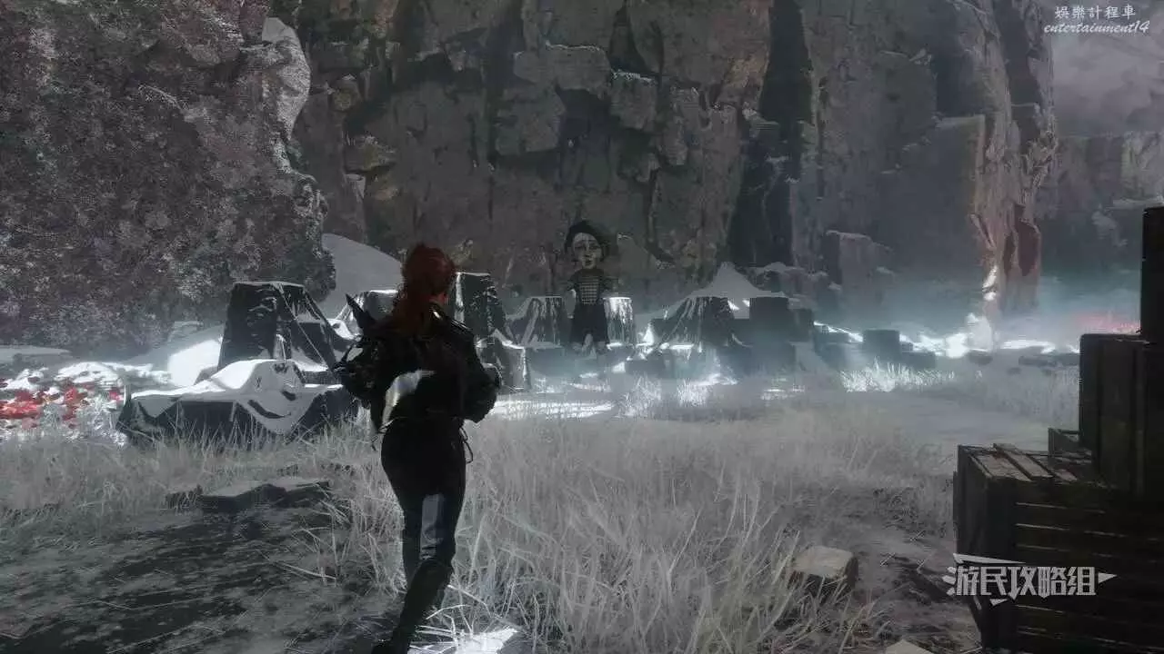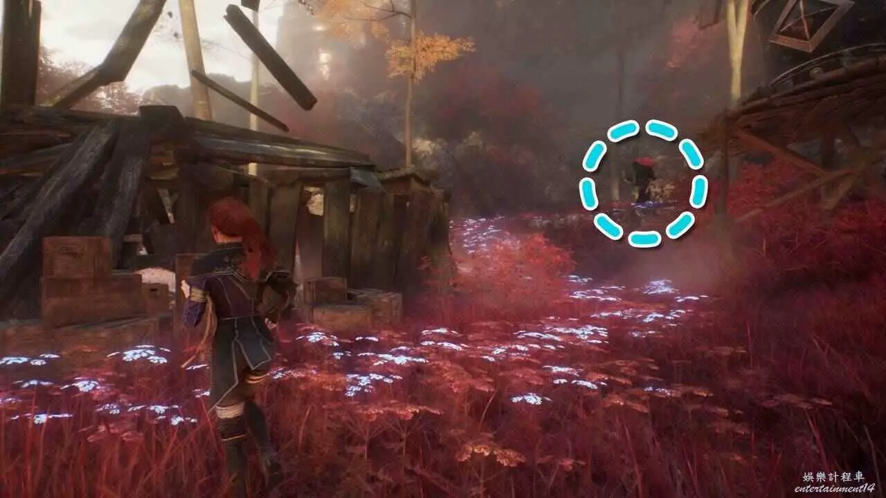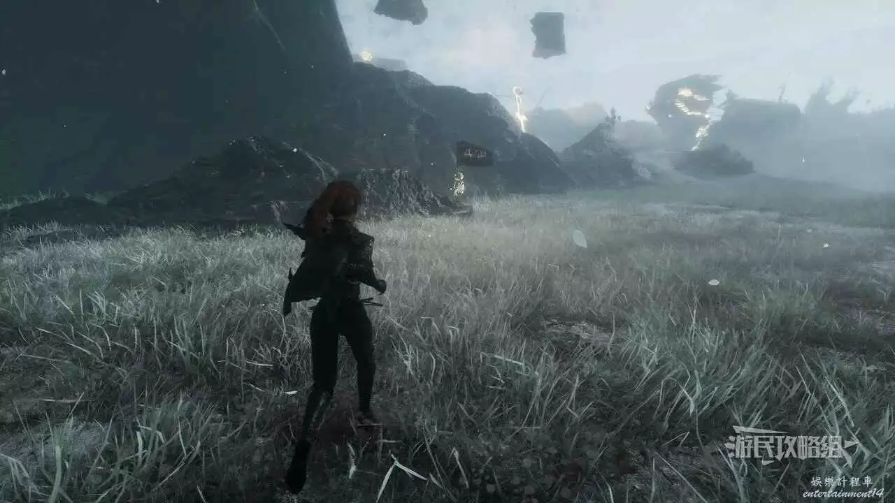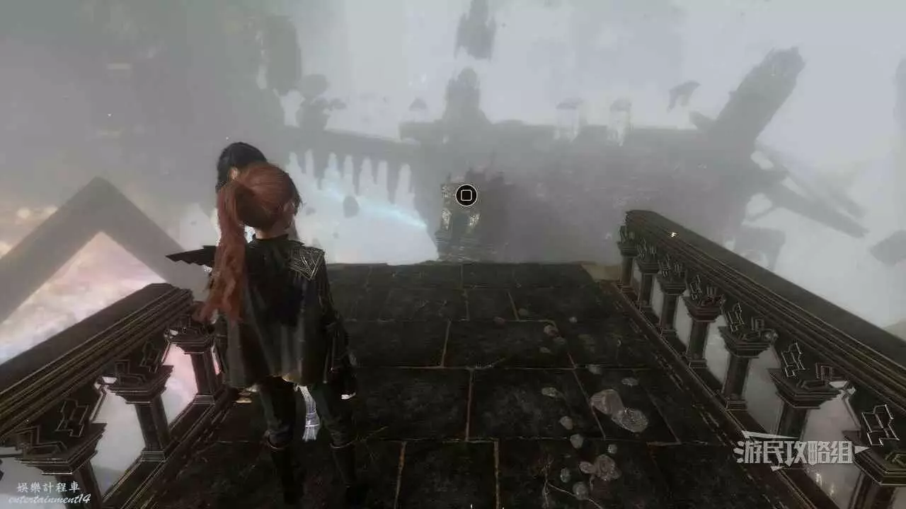 然後快速傳送到【右街】遠征旗,往東北邊的懸崖走,使用鉤索穿過缺口,爬上西北邊的山坡,繼續往北走一段路,可以看到戴著禮帽的灰飛煙滅的人影。